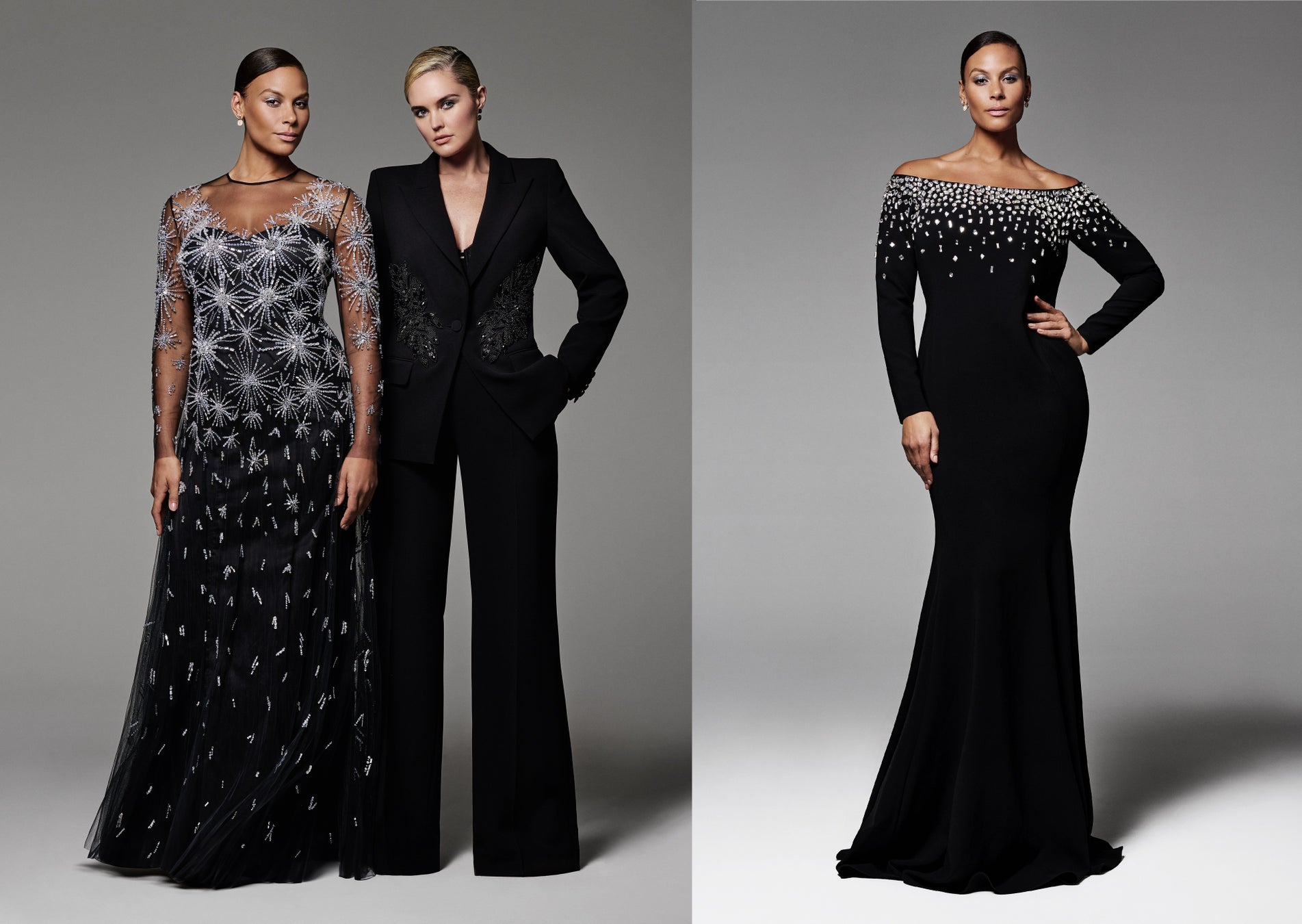 ロマンティックなレースのライニングをあしらったタイトフィットのデザインや、マラブーとオーストリッチの羽で飾り付けられたストレッチキャディーのパープルのジャンプスーツからは華麗な魅力があふれ出します。また、マイクロスパンコールを全面にあしらったルビーレッドのドレスは、フロントのクリスクロスネックラインのバンドがユニークなシルエットを際立させています。