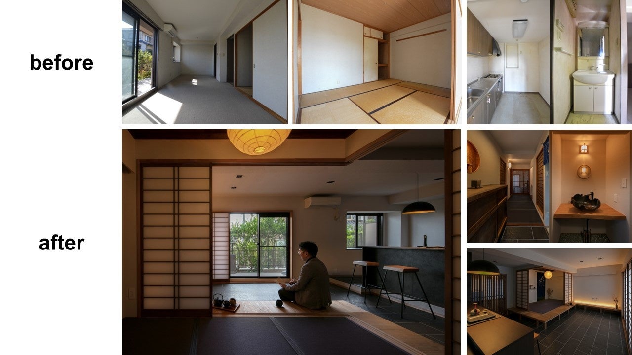 また、同部門では2つの優秀賞も発表されています。株式会社TAKUMI(リノベ不動産|八王子中央店)の「深碧のレイヤード」は凄い深碧の壁とリノベのレイヤード、変わらないスタイルと変わるべきスタイルを織り交ぜた物件。HomeDesignSupport株式会社(リノベ不動産|箕面駅前店)の「解体予定だった古民家再生、父の生家をギャラリーに大改造」は父の生まれ育った痕跡を残したいと、築164年の一軒家をリノベーションした物件です。
