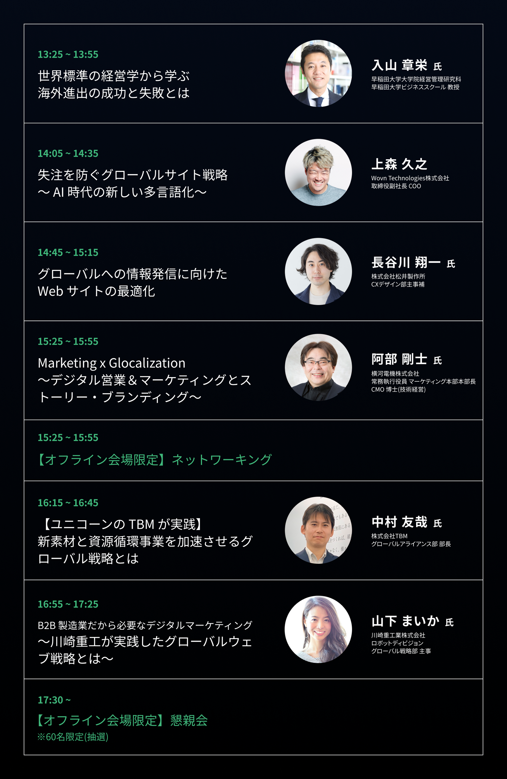 また、多数の海外販路拡大を支援してきた WOVN が海外展開を加速する Web サイト多言語化戦略を解説するとともに、川崎重工業株式会社、株式会社TBM、株式会社松井製作所より Web サイトを活用した海外戦略事例をご紹介します。