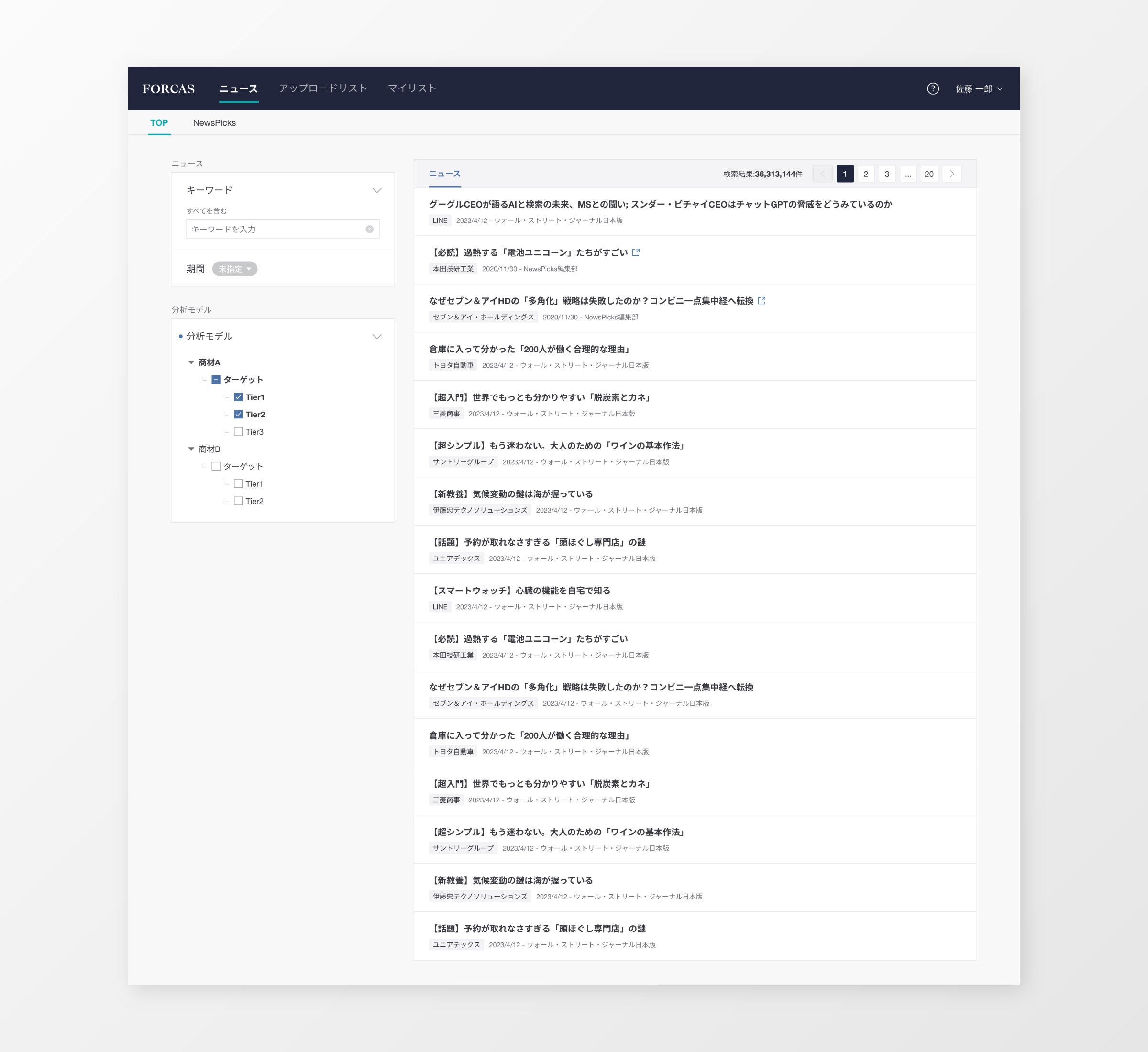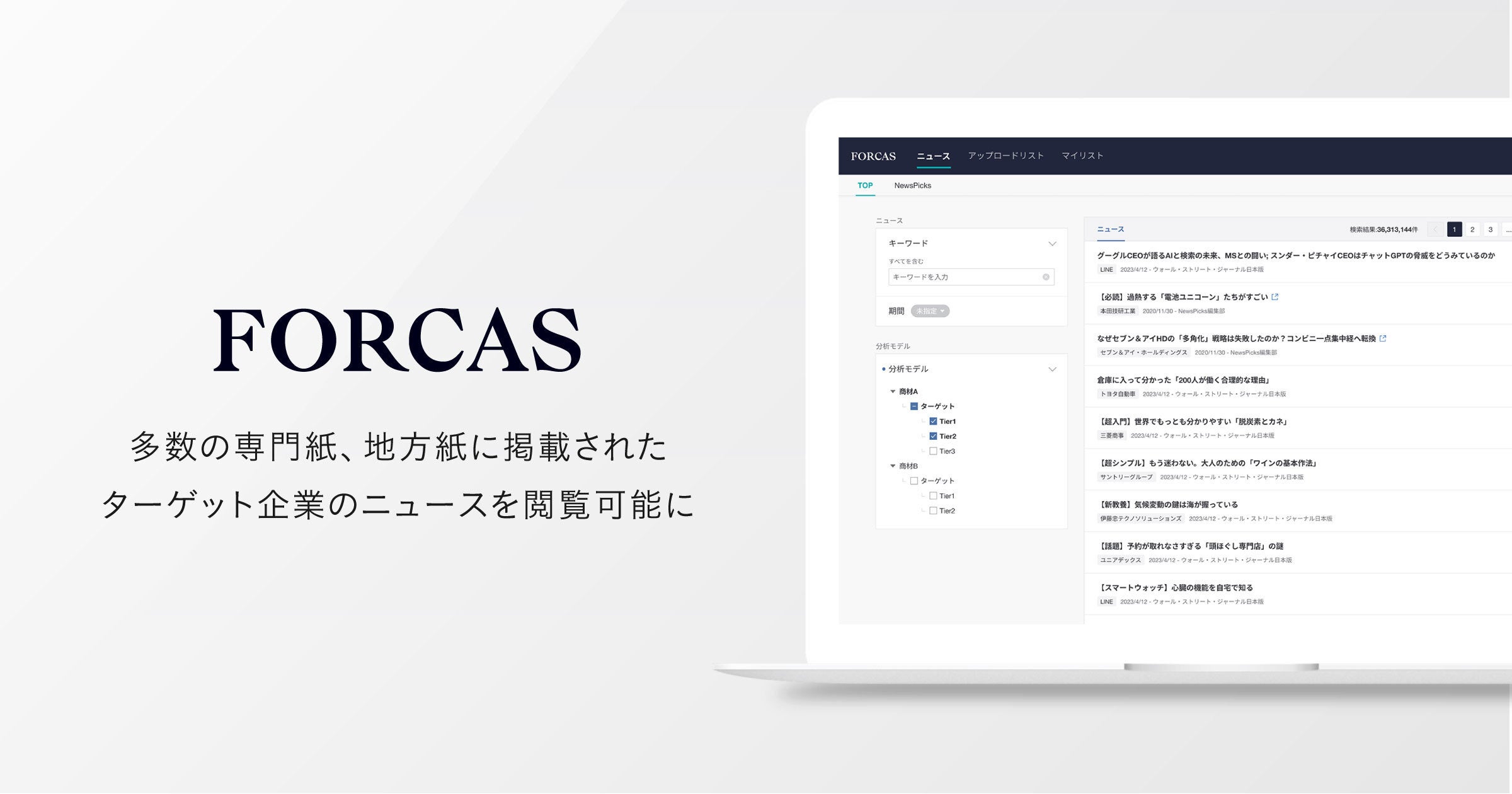 ・FORCASで設定したターゲット企業群(Tier企業)ごとのニュースをFORCAS上で閲覧することができます。
