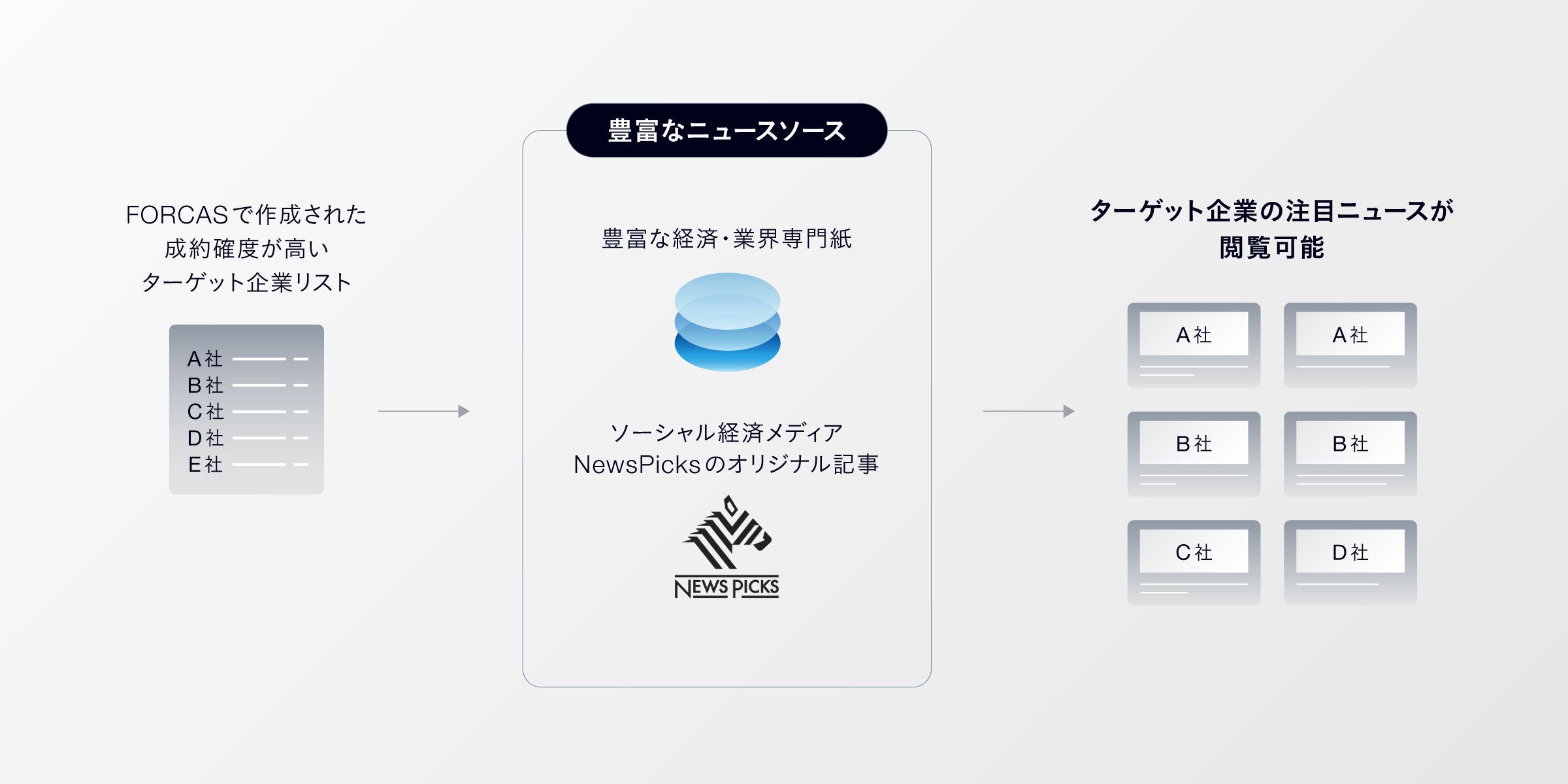 2023年4月に提供を開始した「ニュース」タブの機能を拡張し、FORCASで設定したターゲット企業群に関する情報を、新たに連携したビジネス情報データベースから得ることが可能になりました。通常であれば有料の購読契約が必要なものも含む、多数の専門紙、地方紙が閲覧可能となります。なお、ソーシャル経済メディア「NewsPicks」のオリジナル記事も引き続きご確認いただけます。