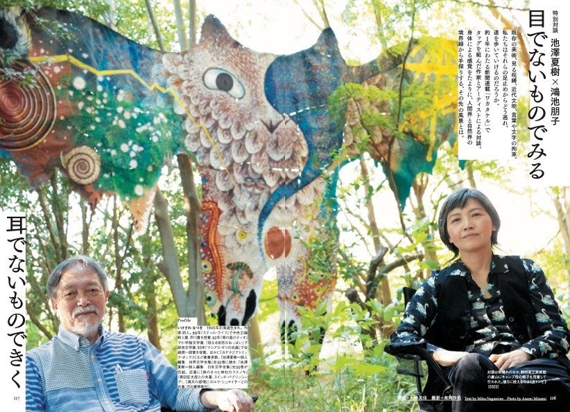 特別対談:池澤夏樹×鴻池朋子「目でないものでみる 耳でないものできく」。既存の美術、見る呪縛、近代文明、言葉や文字の拘束。私たちはそれらの足止めからどう逃れ、道を歩いていけるのだろうか。約1年にわたる新聞連載「ワカタケル」でタッグを組んだ作家・池澤夏樹とアーティスト・鴻池朋子による対談。身体による感覚をたよりに、人間界と自然界の境界線から手探りする、その先の風景とは。