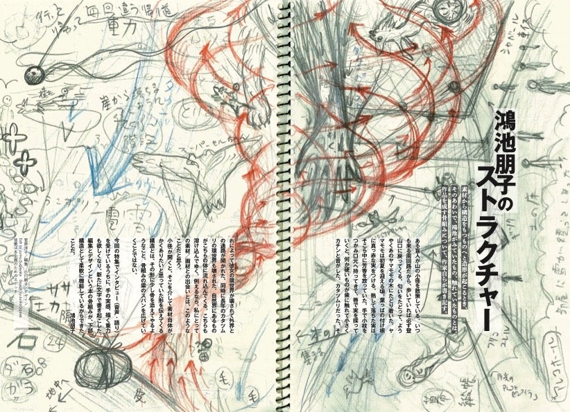 「鴻池朋子のストラクチャー」では、素材から構造をもつものへと造形が起こるとき、そのあわいで、鴻池がみていたもの、触れていたものとは。作品を成す骨組みについて、「ドローイング」「言葉、文字」「仕掛けもの」「家と外皮」「踊り」「遊び」「模型」といったキーワードから、作家自らが書き記す。