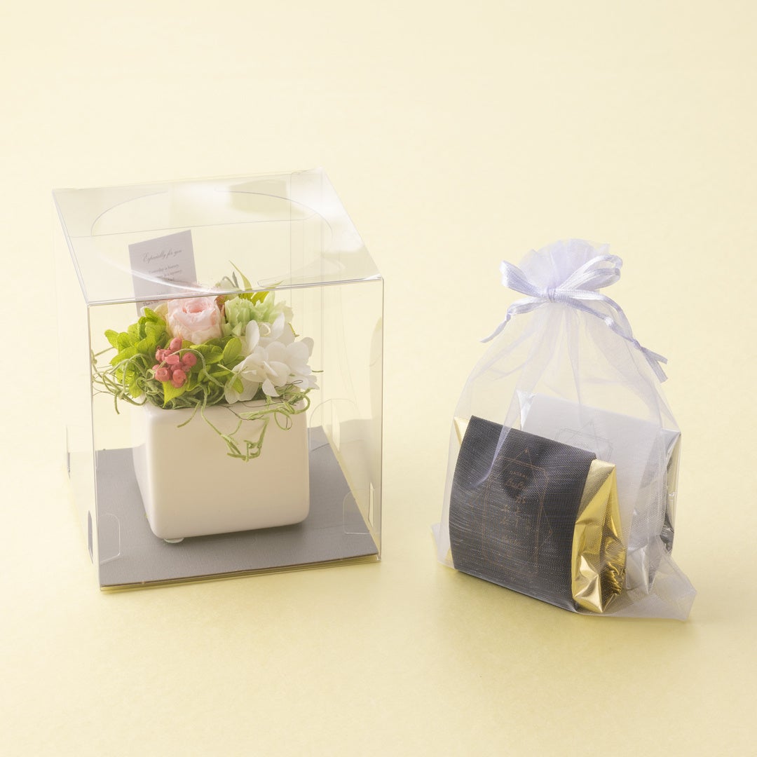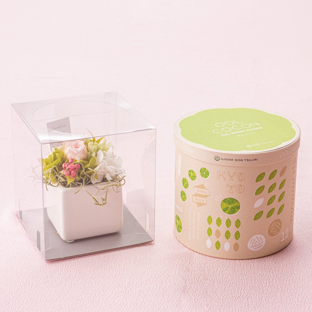 祇園辻利オリジナル巾着、プリザーブドフラワー(薔薇1輪)