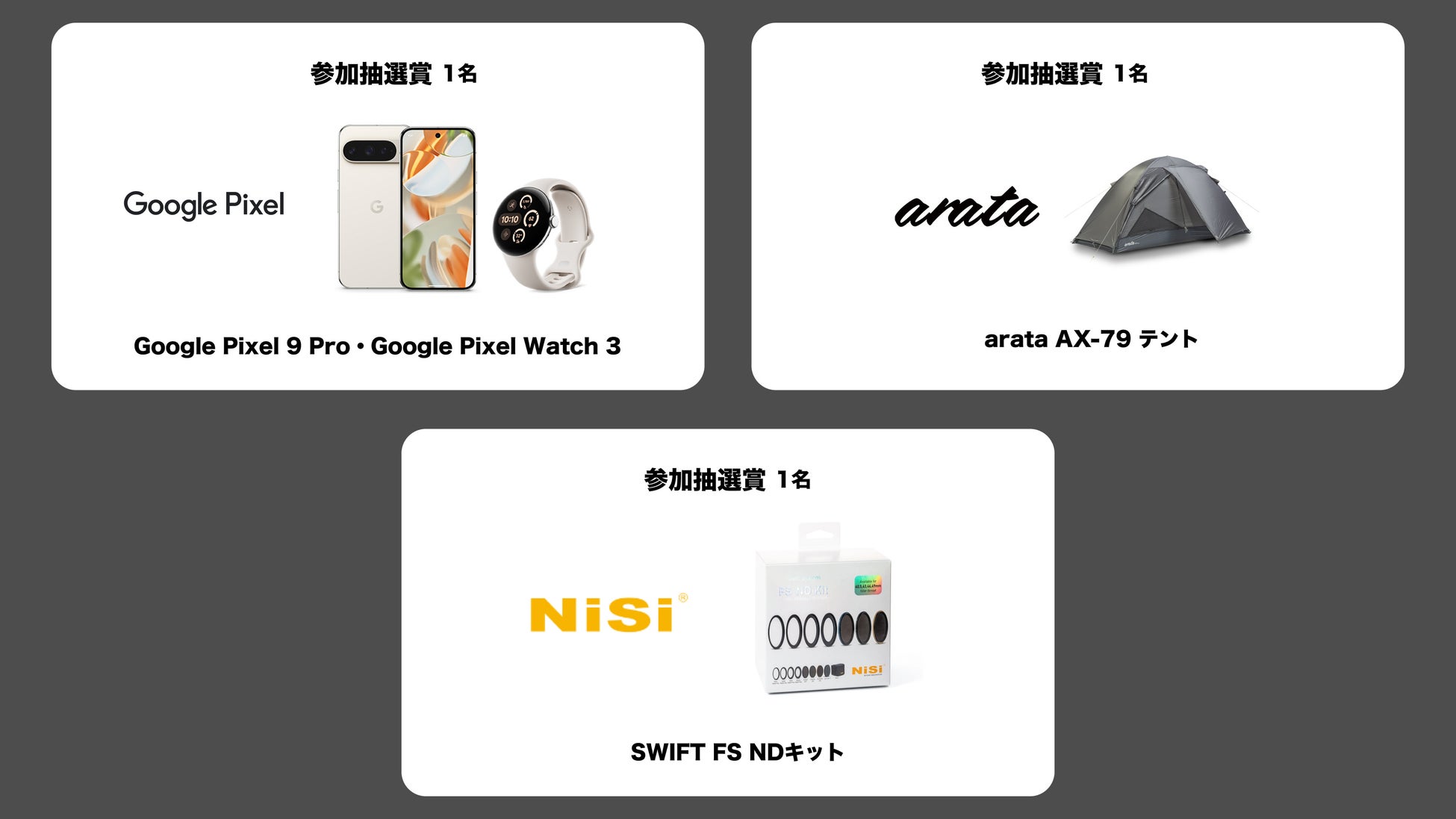 受賞賞品:Google Pixel 9 Pro & Google Pixel Watch 3、写真プリント及び額装券、特製カード及び10万エポスポイント、商品クーポン12万円分、JetMag Pro Kit、[MOUNTAIN GEAR LABORATORY]KENRO P.S. ANORAK、[sn] × YAMA HACK Mountain Basic Tee、arata AX-79 テント、SWIFT FS NDキット、YAMAP STOREこだわりの山道具、YAMAP MAGAZINEでのインタビュー など