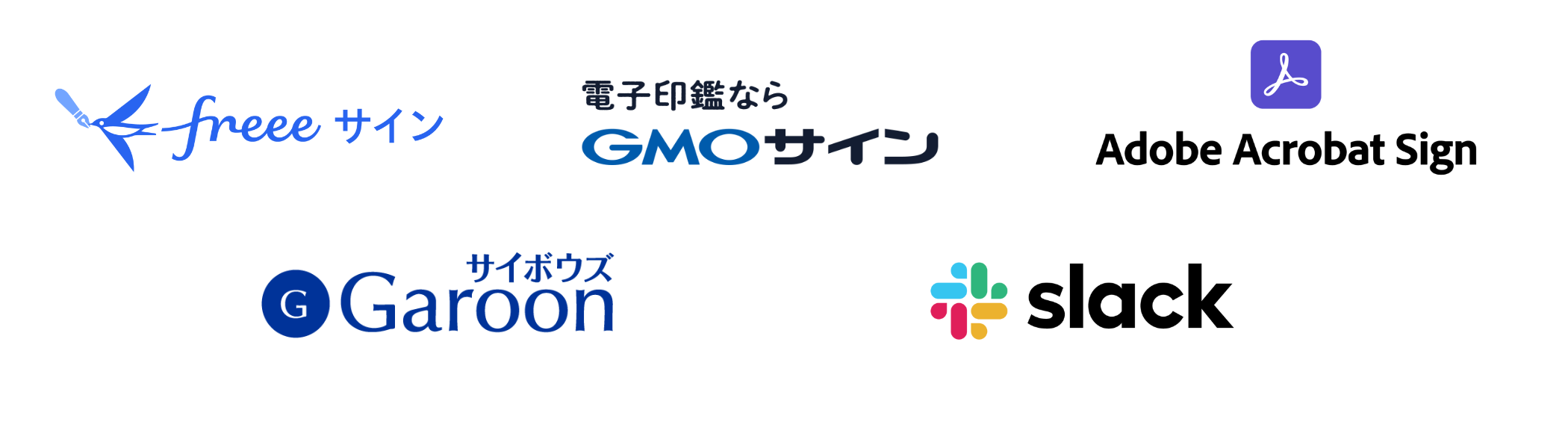 *Adobe Acrobat Signは、Adobe Inc.の米国およびその他の国における商標または登録商標です。電子印鑑GMOサインは、GMOインターネット株式会社の商標または登録商標です。freeeサインは、freee株式会社の商標または登録商標です。Slackは、Slack Technologies Limitedの米国およびその他の国における商標または登録商標です。Garoonは、サイボウズ株式会社の商標または登録商標です。