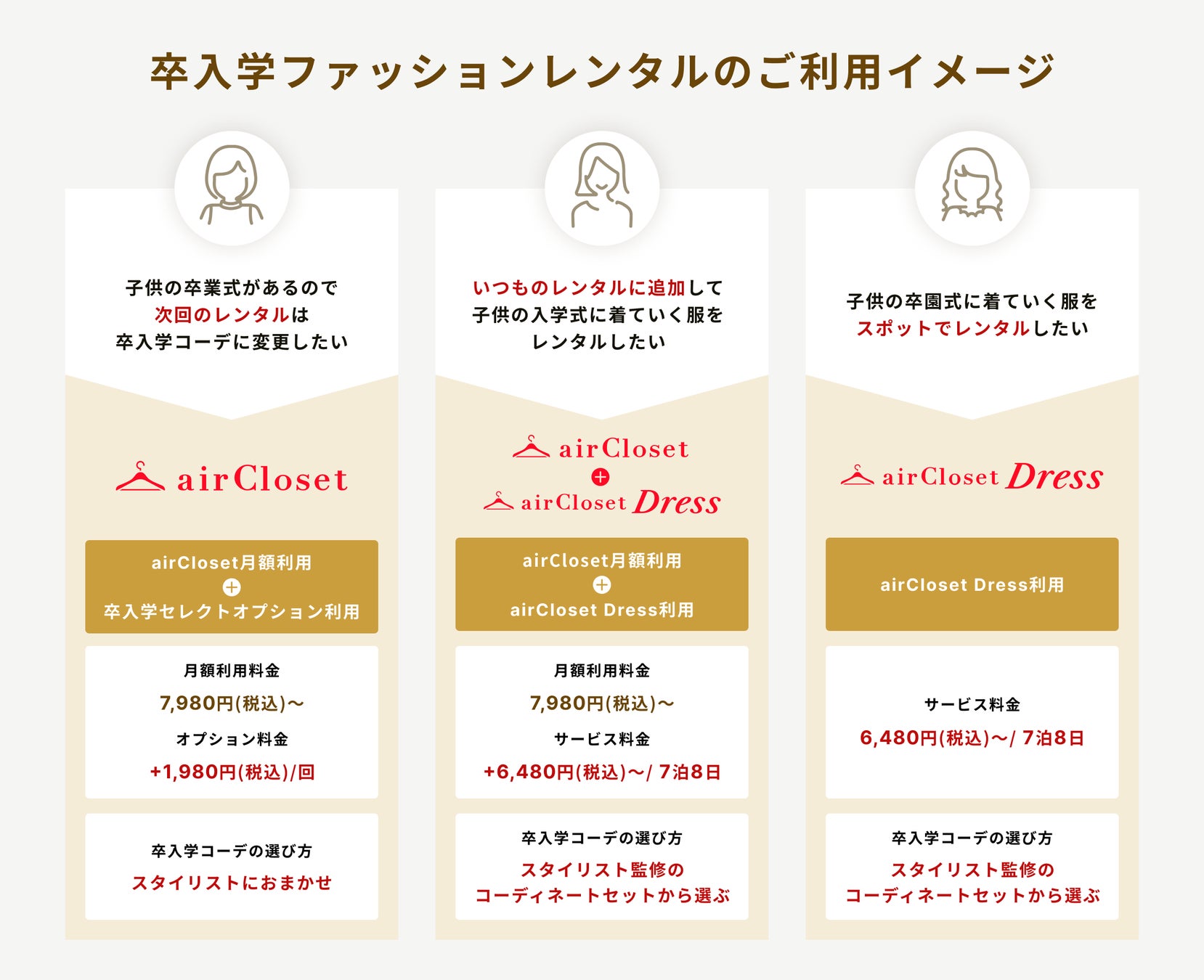 本オプションでは、『airCloset』で届くお洋服を、卒業式や入学式のタイミングに合わせ、”ハレの日”に合うお洋服に変更することが可能です。