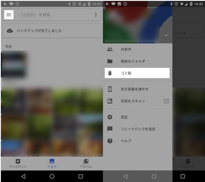 Googleフォトにバックアップと同期機能をオンにしていれば、削除した写真もGoogleフォトのゴミ箱に60日間残ります。Googleフォトアプリを開いて、左上のメニューからゴミ箱を選択してみましょう。復元したい写真があれば、選択して復元ボタンをタップすれば、元の場所に戻ります。