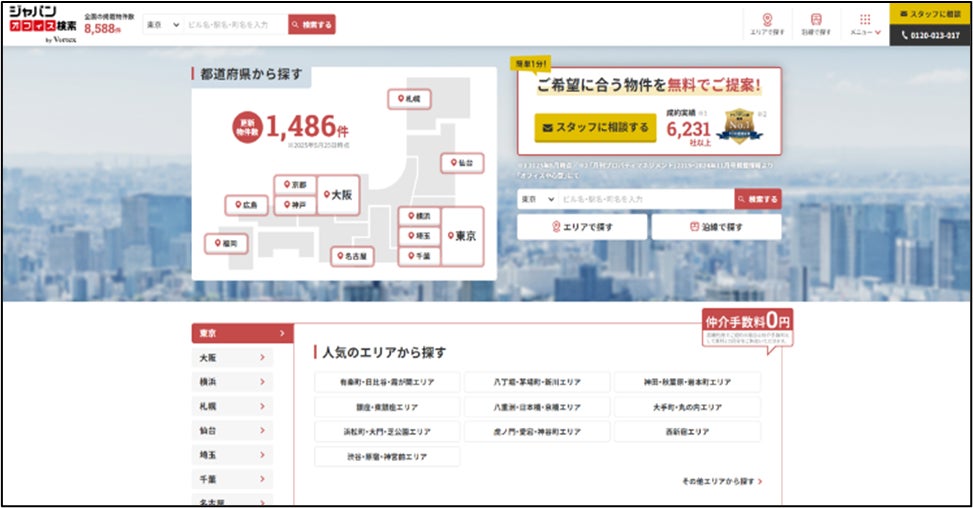そのご要望にお応えすべく、サービス開始20周年の節目である2025年6月に、東京・大阪・名古屋・福岡など主要都市のオフィス情報をご提供し、移転をサポートする検索サイトとして「ジャパンオフィス検索」をリリースいたしました。 「ジャパンオフィス検索」は、サービス開始以降、20年にわたり6,200件を超えるオフィス移転のお手伝いをしてきた実績をもとに、お客様のご希望に合わせたオフィス移転を実現してまいります。