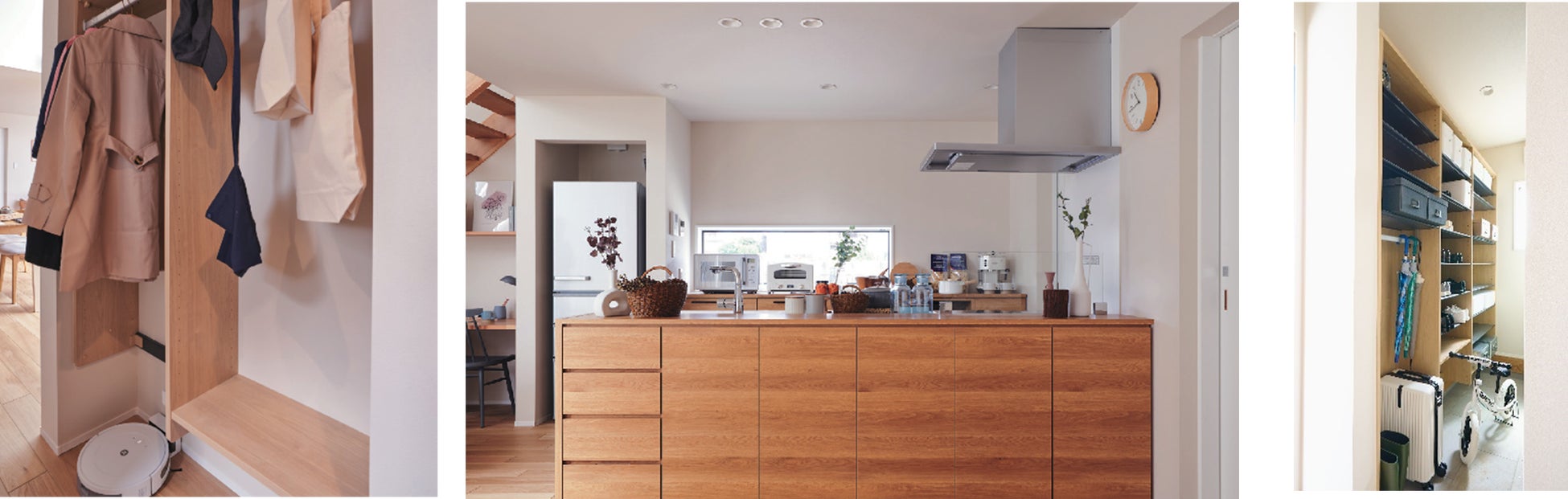 引戸や収納は上吊り式を採用し床面をフラットにして、ロボット掃除機がスムーズに動ける工夫をしました。キッチンの前面や、シューズインクローゼットなどに、収納スペースを豊富に設け、整理整頓がしやすい仕様にこだわりました。