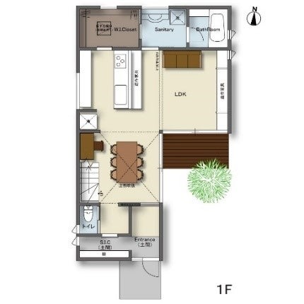 収納を設けその場で身支度ができる玄関や、間仕切りのないLDK、キッチン~ウォークインクローゼット~洗面室~浴室へのスムーズな動線、大きな窓からつながるウッドデッキなど、効率的で快適な間取りを実現しています。