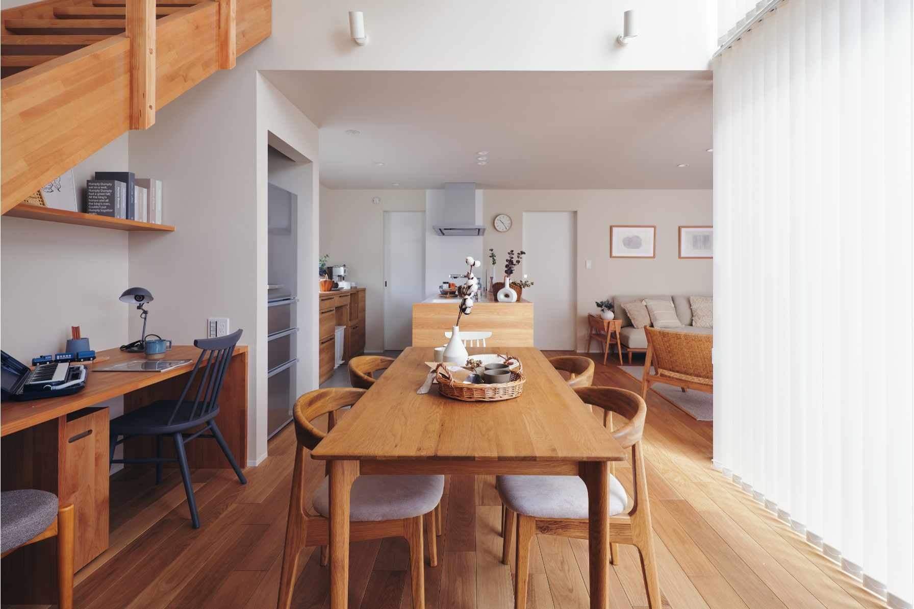 自然や風を感じられる吹き抜け空間を設置し、動線に連続性を持たせることで、回遊性のある機能的な間取りを実現しました。 家事や育児、家族のコミュニケーションがしやすい作りです。