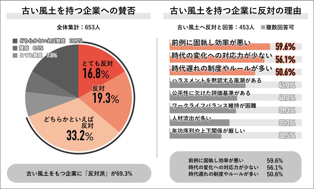 ・全体の69.3%が古い風土を持つ企業に「反対」 理由は「前例に固執し効率が悪い」「時代遅れ感」が上位