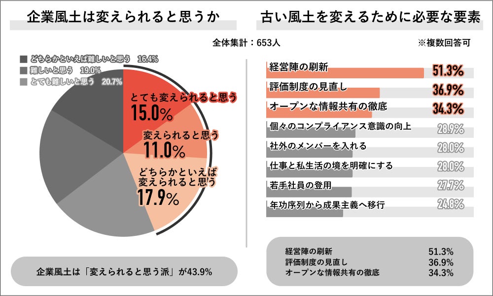 ・全体の43.9%企業風土は「変えられると思う」 変化に必要なのは「経営陣の刷新」「評価制度の見直し」