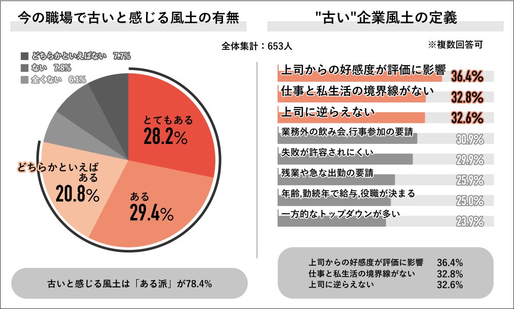 ・全体の78.4%が「今の職場に古いと感じる風土あり」 古いと感じる風土1位は「好感度が評価に影響」