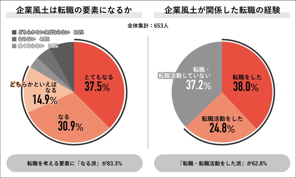 回答者全体の653人に企業風土は転職を考える要素になるかを聞くと、「なる派」が83.3%で過半数を占め、内訳は「とてもなる」37.5%、「なる」30.9%、「どちらかといえばなる」14.9%でした。企業風土が関係した転職の経験を聞くと、「転職・転職活動をした派」が62.8%で過半数を占め、内訳は「転職をした」38.0%、「転職活動をした」24.8%でした。
