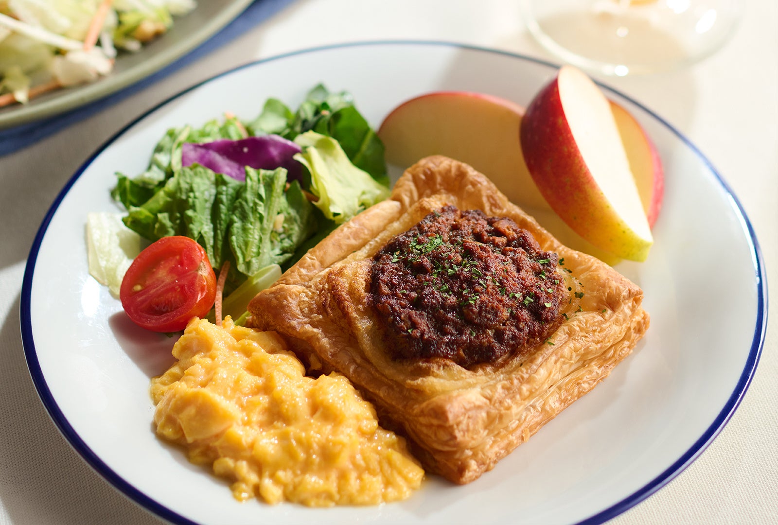 サクサクのパイに、ワイン香るデミグラスソースを加えたお肉たっぷりのミートソースと、なめらかなマッシュポテトを合わせた満足感ある自信作。ミートソースの隠し味にはりんごペーストを加えており、ほのかな甘みがおいしさのポイントです。