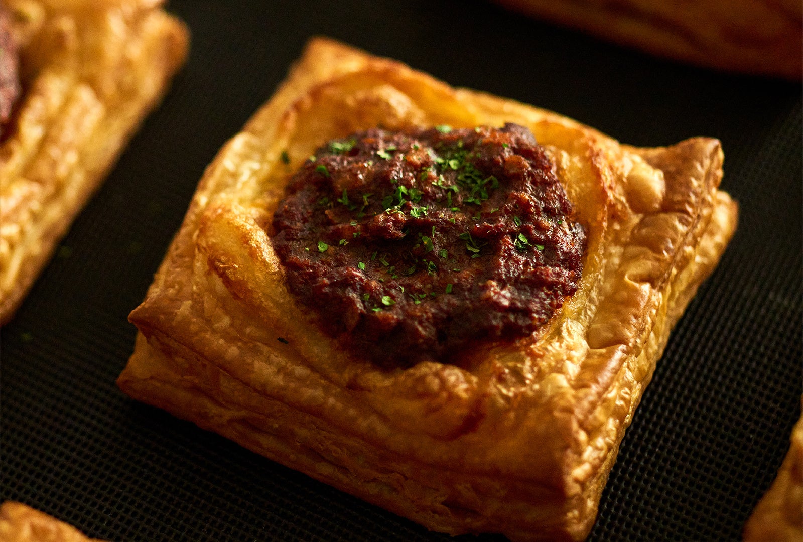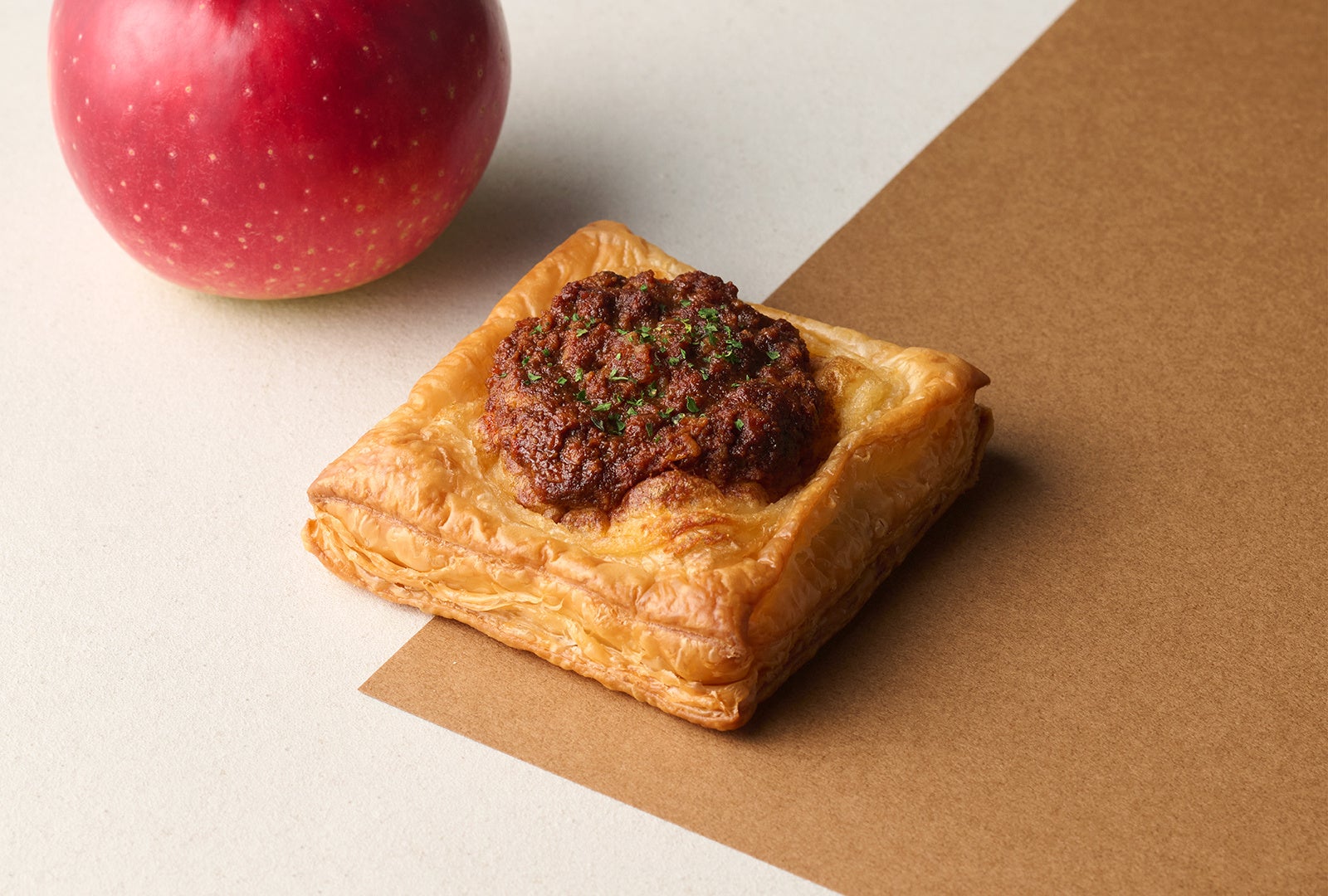 食欲そそる、RINGO初のお食事パイが新登場。ワイン香るデミグラスソースを和えたたっぷりのお肉に、隠し味でりんごペーストを加え、コクと甘みを兼ね備えた満足感のあるお食事パイに仕上げました。