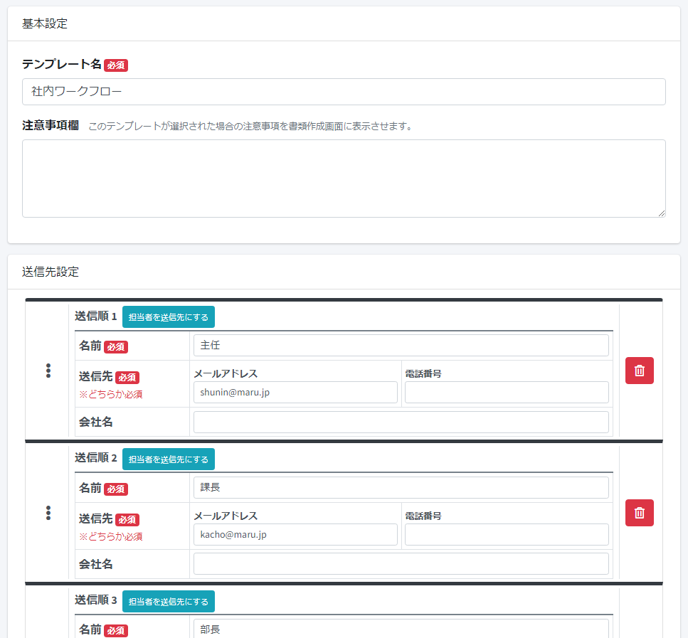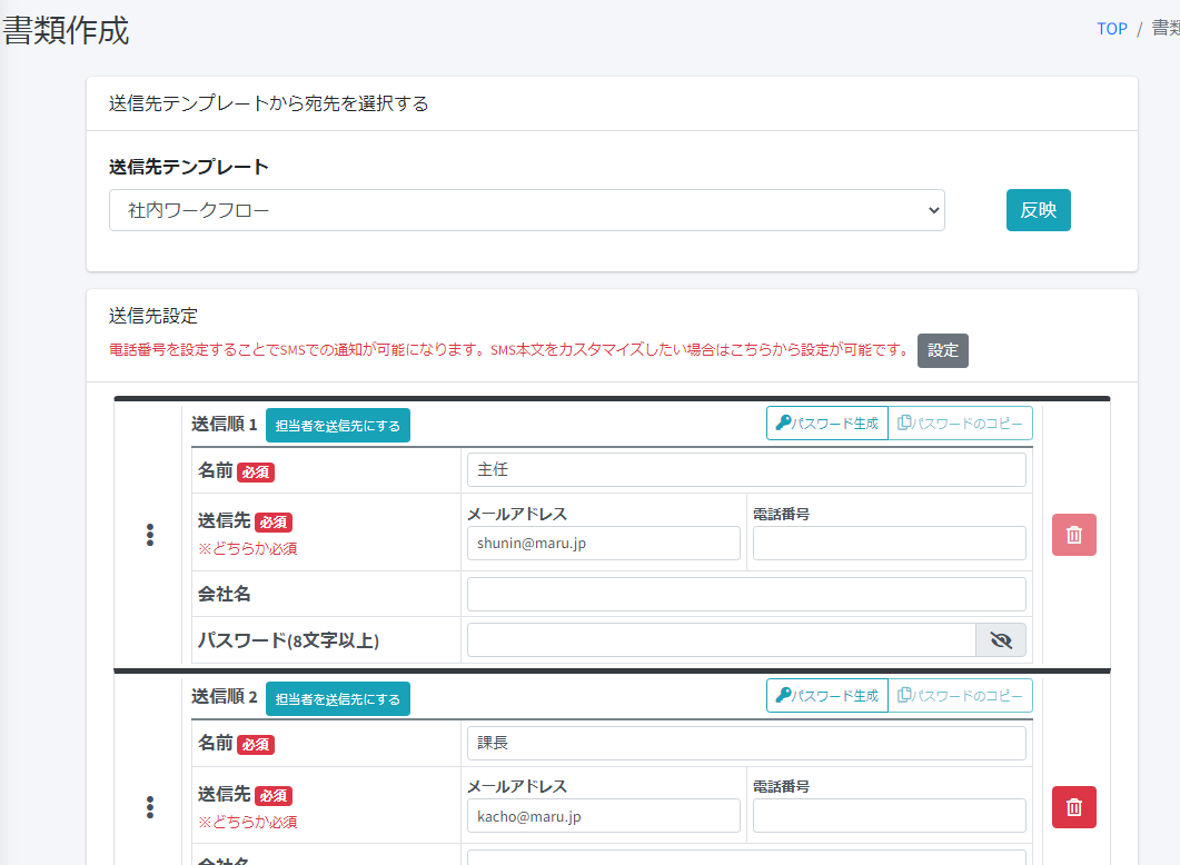 電子契約は便利ですが、実際に書類、契約書を取り扱う業務では、書類を送付する際に社内稟議をワークフローで通したり、書類の内容によっては相手先が毎回決まっていたりと、同じ経路で書類を送付する際に毎回送信先を入力するのは手間になります。