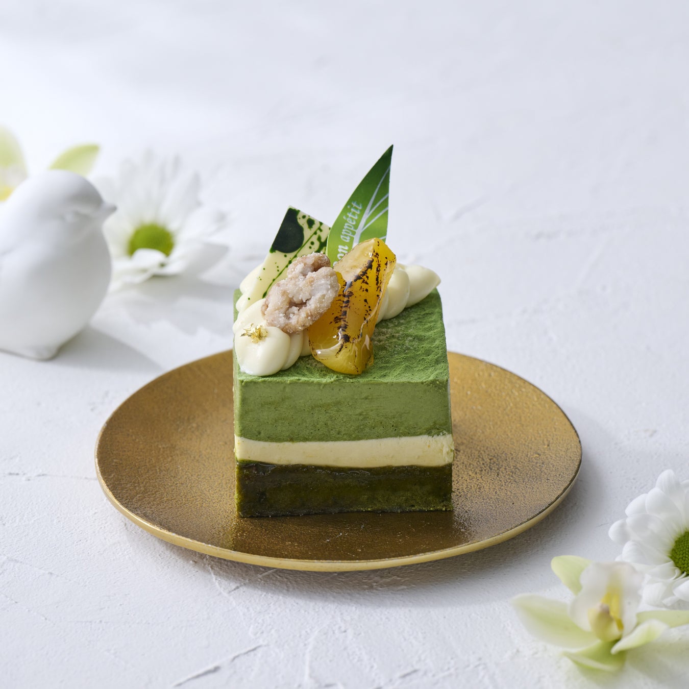 抹茶ブラウニーにホワイトチョコレートと抹茶のムースが重なった、層の配色が美しいスイーツです。ほろ苦く甘い味わいの中に、随所にあしらったアプリコットの酸味がアクセントとなり、口の中で味の広がりをお楽しみいただけます。