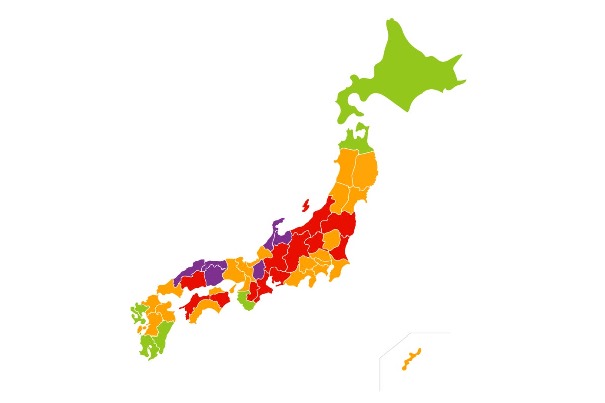 特に、北陸地方や中国地方は指数レベルの最大領域『かなり出ている』を指す紫色に染まっていることから、シロアリ発生のピークといえます。