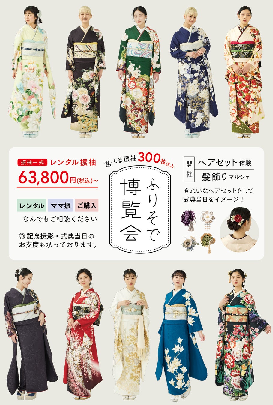 300枚以上の色柄豊富な振袖をはじめ、髪飾りマルシェやヘアアレンジ体験など、装いをトータルで体験いただけます。