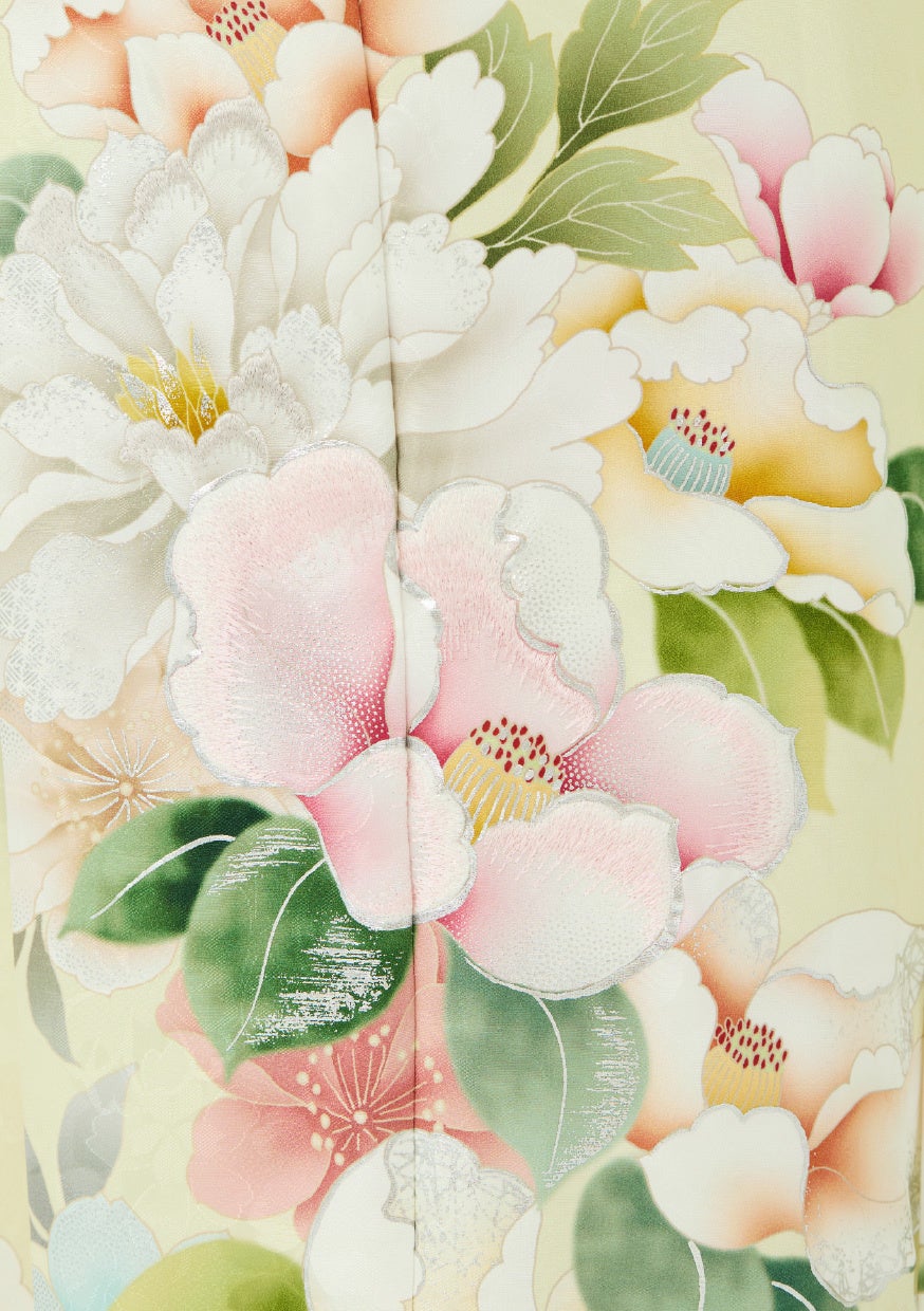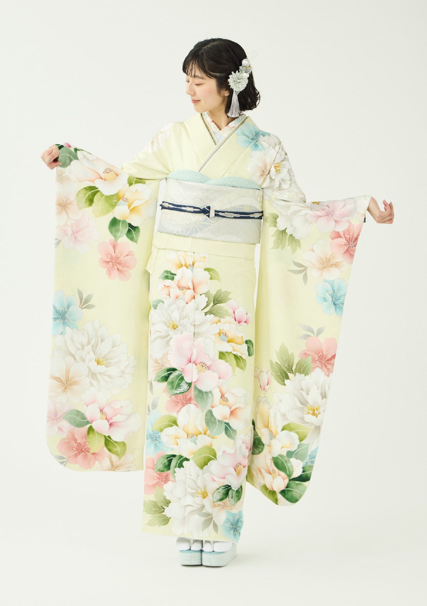 優しい色合いで透明感あふれる振袖。ライトイエローの地色が、桜・牡丹・椿などの花々を引き立てる華やかで可憐な一枚です。アクセントに水色やグリーンを効かせることで、甘くなりすぎない印象に。寒色系の小物と帯〆で洗練されたスタイリングに仕上げています。