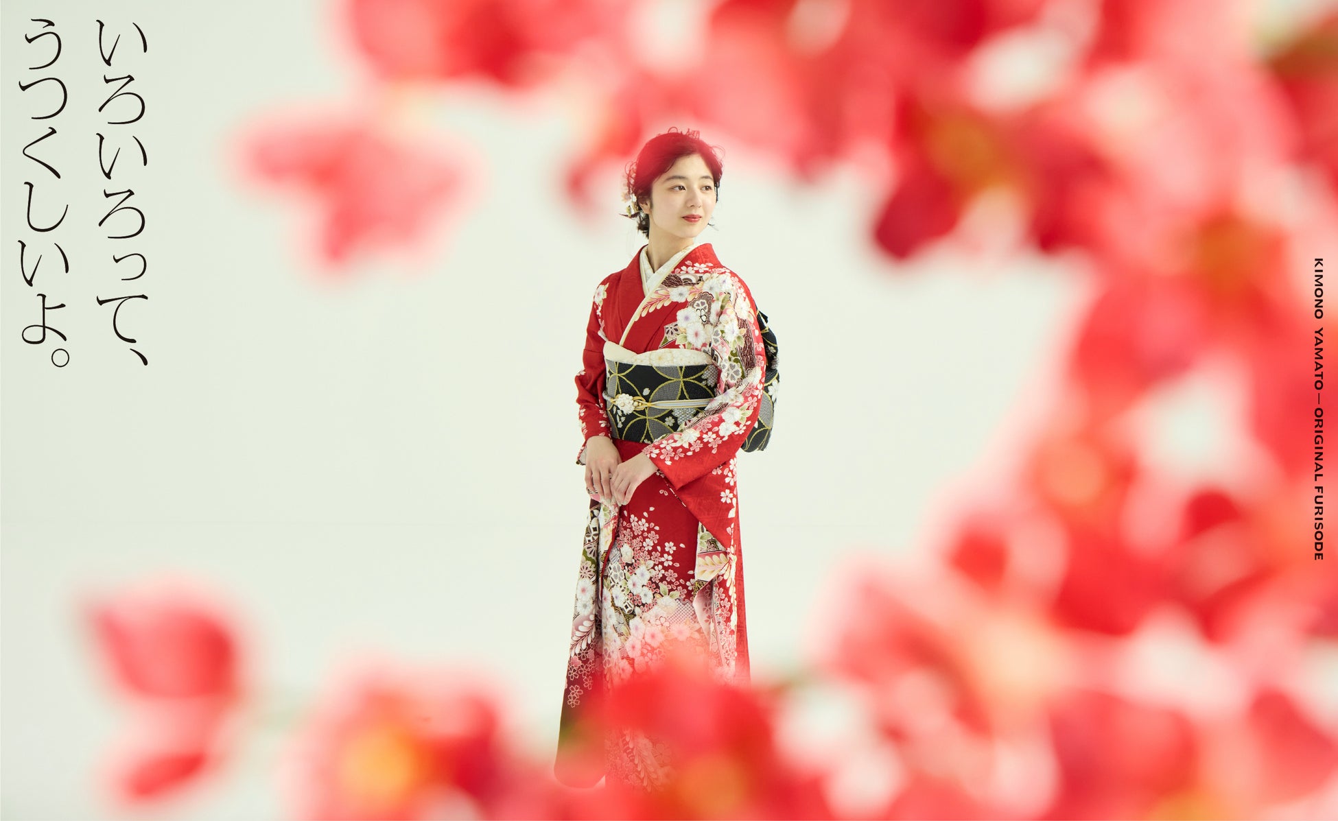 振袖を纏った女の子がそれぞれの“色”の花に包まれている姿には、「自分らしい一着と出会ってほしい」という想いが込められています。誰かに決められるのではなく、自分で好きな色を選ぶ楽しさを、きものやまとは応援します。
