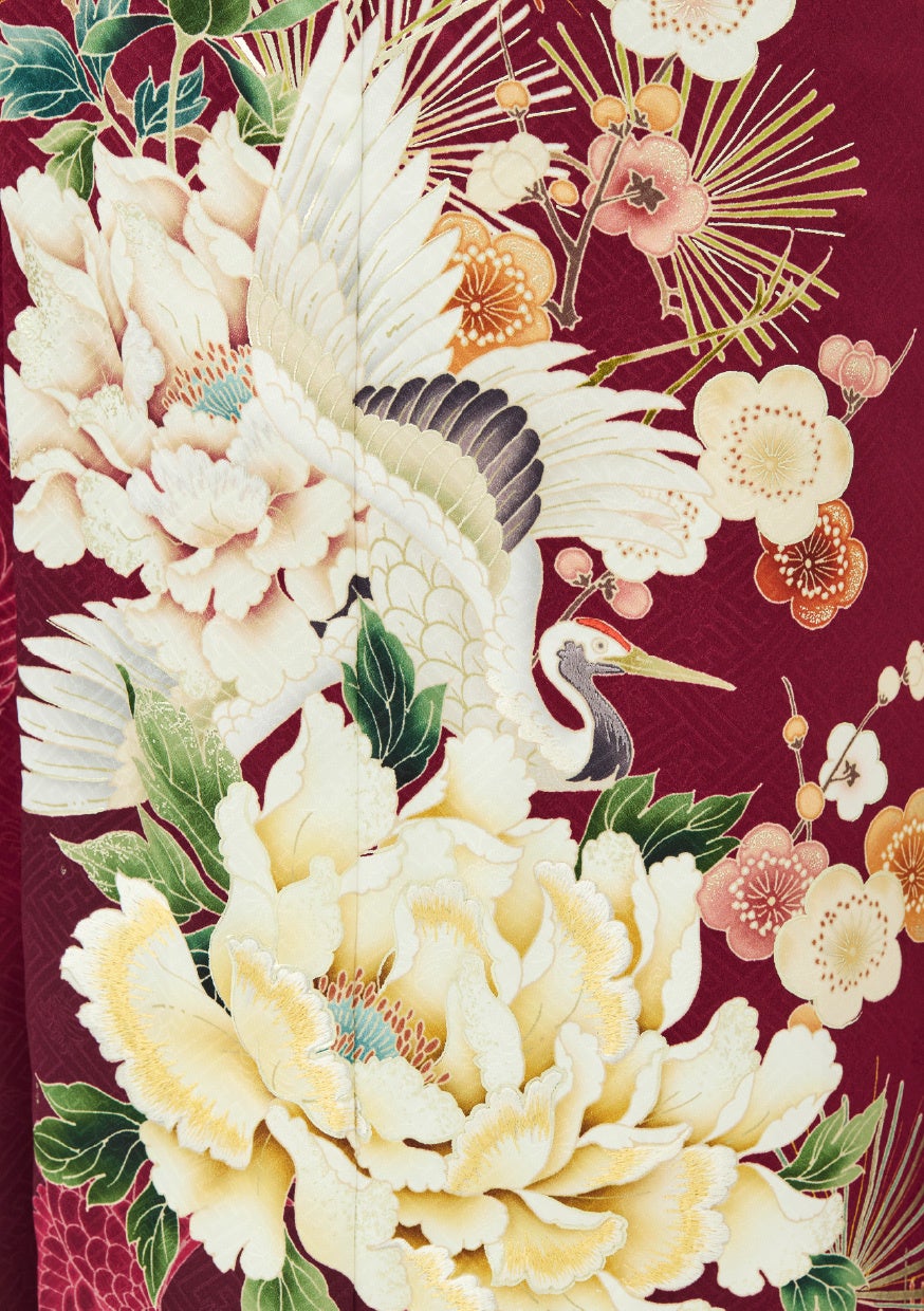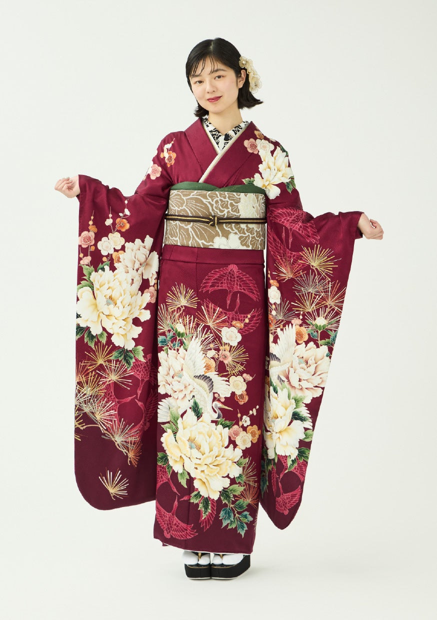 深みのあるエンジ色をベースに、鶴や牡丹、松といった縁起柄を大胆に配置した格式と華やかさを兼ね備えた振袖。黒の半衿や茶系の帯でまとめたスタイリングで、モダンでかっこいい印象に仕上げています。