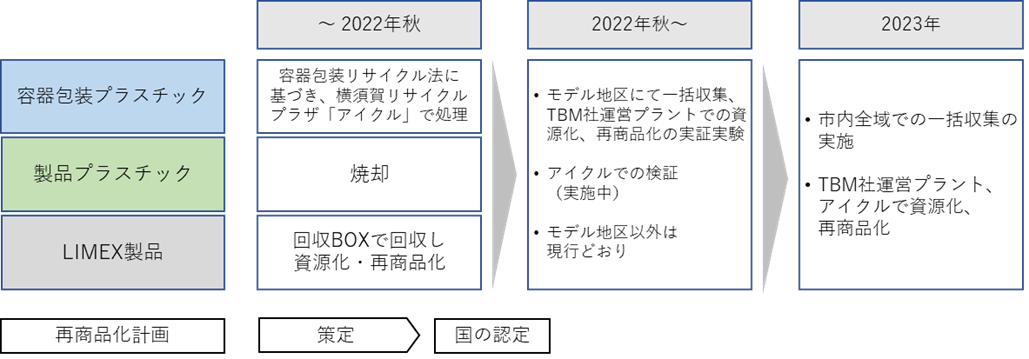 プラ新法に基づく再商品化計画を横須賀市と連携して策定し、横須賀市内の家庭から排出されるLIMEX製品、容器包装プラスチック、製品プラスチックの一括収集及び資源化・再商品化に向けた検討を行います。