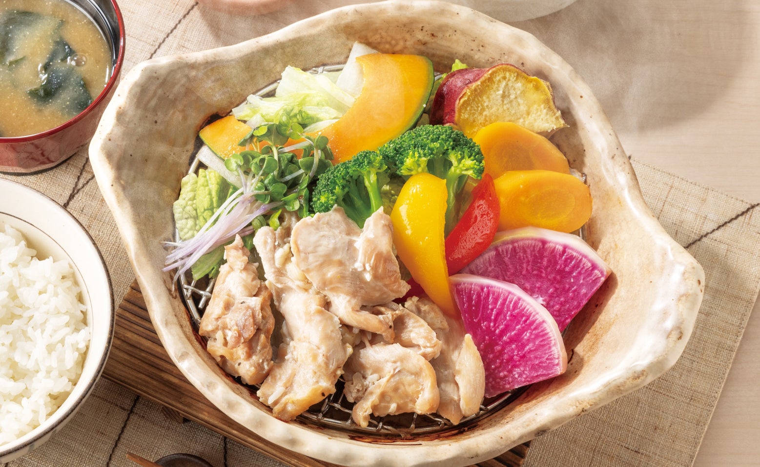 たんぱく質がしっかり摂れる鶏もも肉と、様々な栄養豊富な野菜が入っており、さらに蒸して調理することで余分な脂質をカットした、バランスの良い定食に仕上げました。彩り豊かな野菜の旨みを味わうことができ、お肉と野菜に相性バッチリな特製味噌ダレがクセになる一品です!
