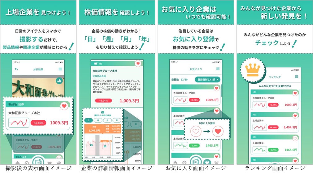 本アプリは、マルチモーダルな生成AIを利用し、本アプリ利用者の撮影した写真から連想される企業の株価等の投資関連情報を表示します。本アプリ利用者は、スマートフォンによる撮影という手軽な方法から企業の株価等を調べることができ、金融経済分野になじみのない方でも、身の回りの物品から投資や資産運用に関する情報を手に入れることができます。