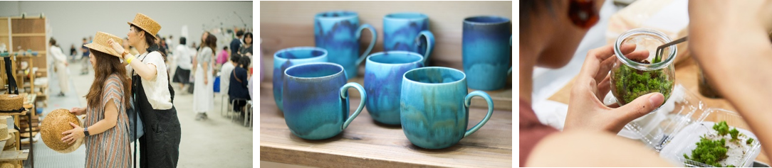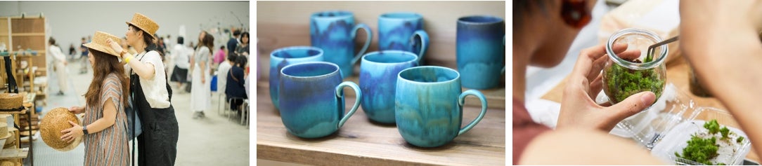 会場内には、アクセサリーやバッグなどのファッションアイテムからインテリア、キッチン、アート、器、手工芸品など、全国各地で活躍するクリエイターがオリジナル作品を展示・販売するマーケットや、伝統工芸士や人気クリエイターの約70種のものづくりを体験できるワークショップが集まる「クリエイターエリア」、8組のアーティストによるライブステージが展開される「ミュージック&プレイエリア」、日本各地から選りすぐりの手作りフードが集まる「フードエリア」に分かれ、ここでしかできない体験を通して五感でクリエイティビティを体感できる空間となります。