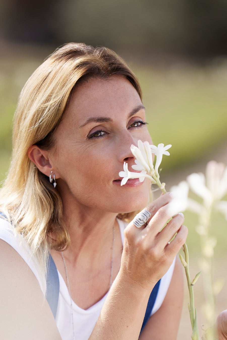 伝統的なアンフルラージュ製法によって捉えた、フレッシュなチュベローズとセンティフォリアローズのセンシュアルな香りがパウダリーなヴァイオレットとアイリスと融合し堂々と咲き誇ります。サンダルウッドの暖かさとベルベットのようなモスがブーケを支え、リッチなウッディノートへと広がります。