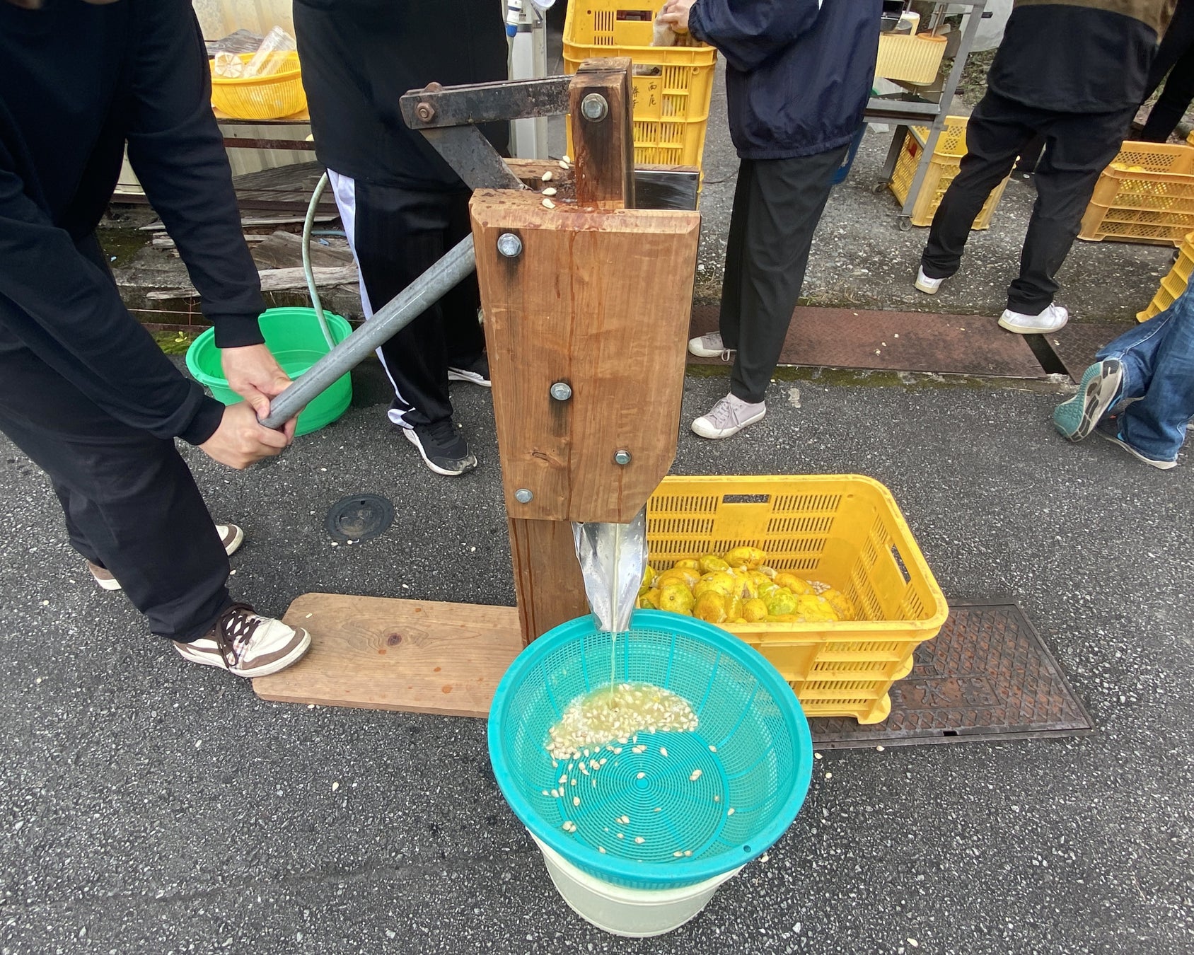 6回目となる今回の収穫支援では、ウテナ社員とウエルシアグループ社員15名が参加し、ゆずの木の鋭いとげに気を付けながらゆず果実を1つ1つ丁寧に収穫しました。また、搾汁も体験させていただき、農家の方々の大変さを身をもって感じる貴重な機会となりました。