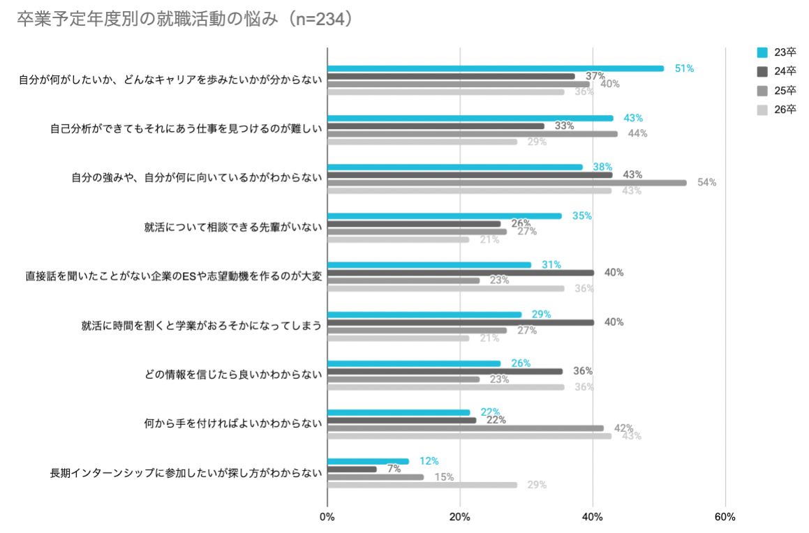 当社が2022年12月に学生を対象に実施した調査において、就職活動における悩みを聞いたところ、2023年の3月に卒業した23卒学生の51%が「やりたいことや歩みたいキャリアがわからない(=キャリアビジョン)」と回答するという結果に。