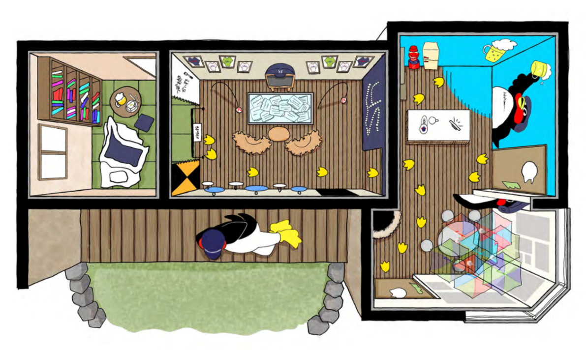 内装は、実際につば九郎が住む部屋と、つば九郎の功績が楽しめるミュージアムの2区画から構成されています。つば九郎の部屋では、畳の部屋に敷きっぱなしの万年床、ちゃぶ台、競馬新聞、飲み干したビールの空き缶などつば九郎のリアルな生活風景を思う存分ご堪能いただけます。