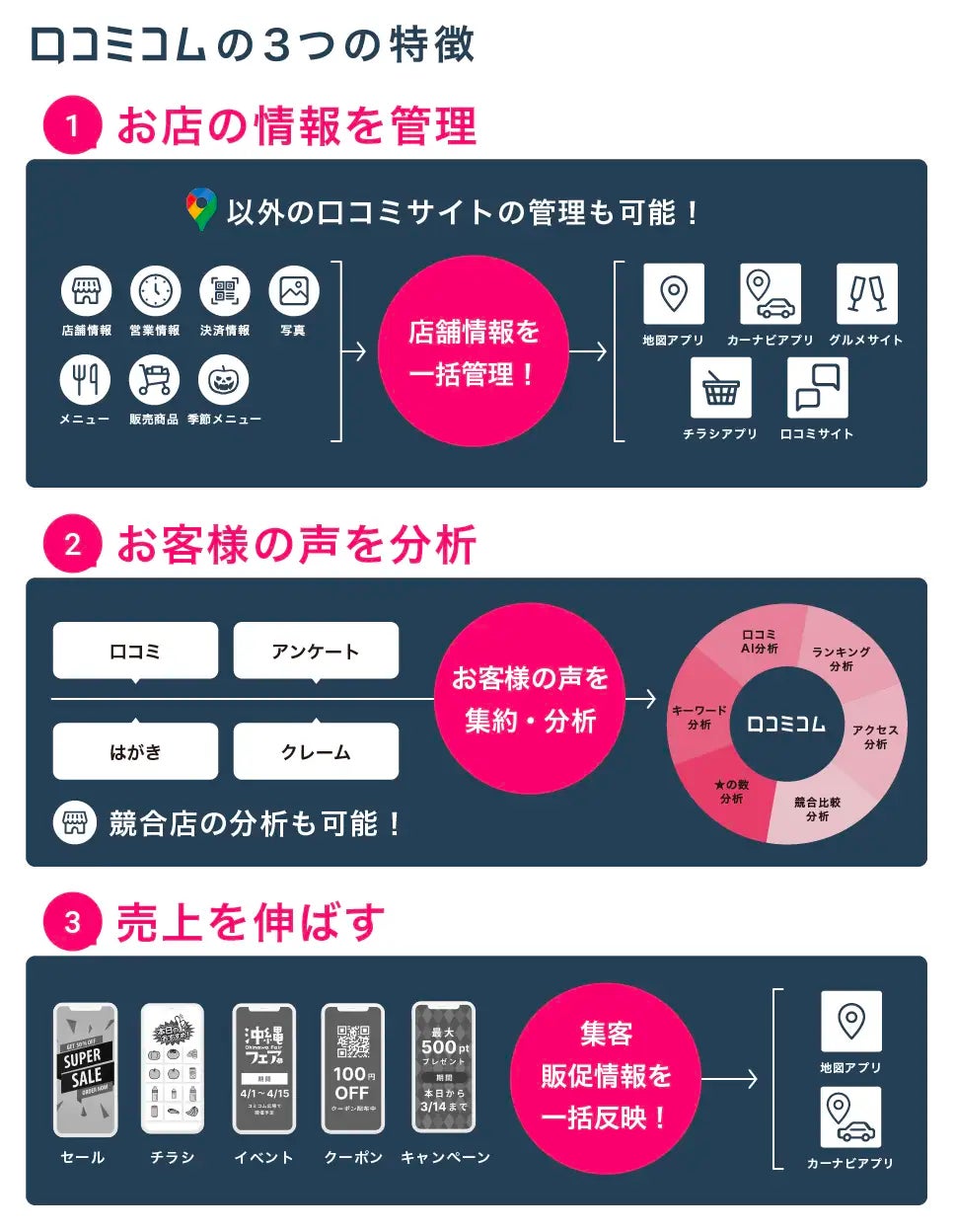 口コミコムは、Googleマップをはじめとした地図アプリや口コミサイトでの店舗情報を整理し一括更新できると同時に、お客様の口コミ分析、クーポンの配信まで行うことで、国内外の口コミサイトを”もっと”売上に変える「口コミサイトの一括管理ツール」です。