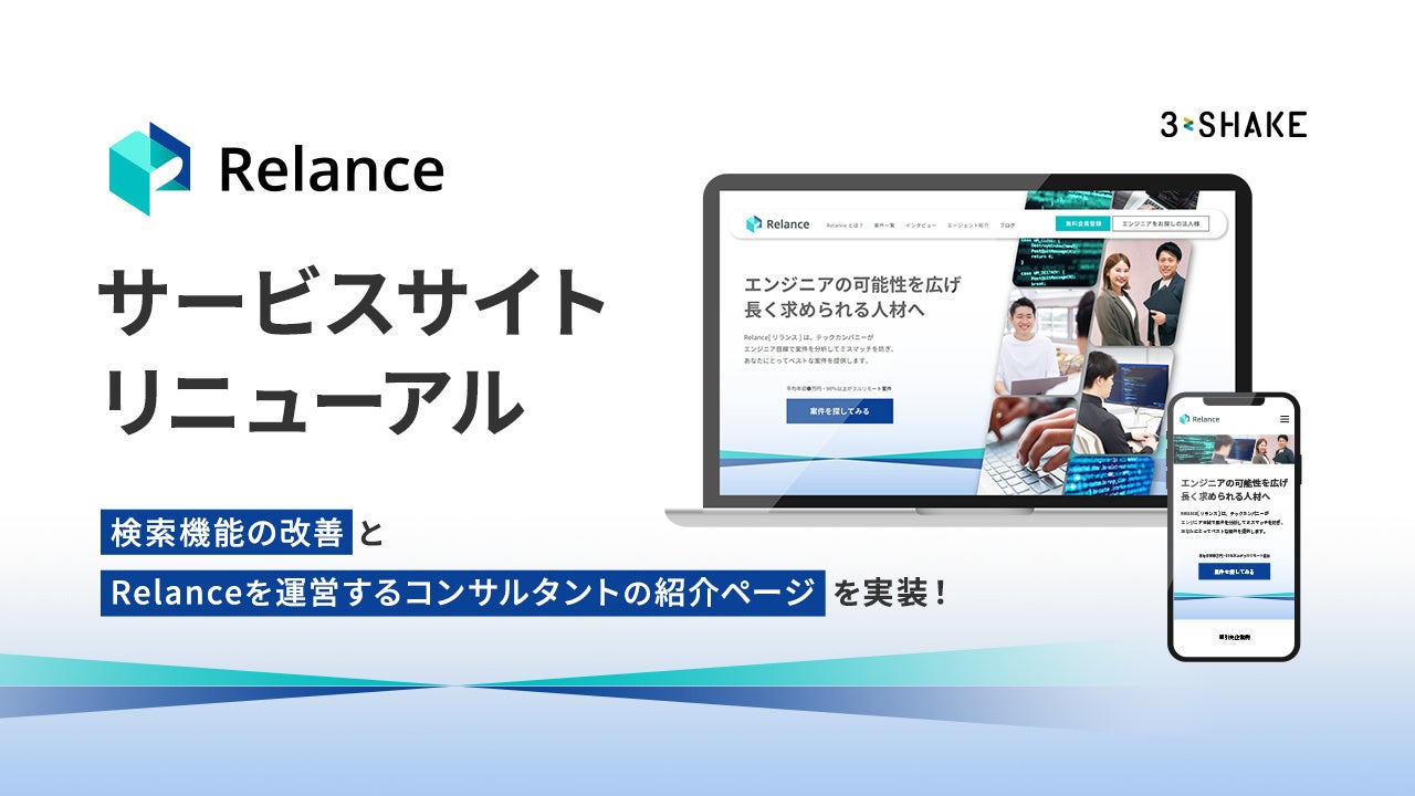 株式会社スリーシェイク(本社:東京都新宿区、代表取締役社長:吉田 拓真、以下スリーシェイク)は、フリーランスのITエンジニア向け案件紹介サービス「Relance(リランス)」(以下、Relance)のサービスサイトをリニューアルしたことをお知らせします。