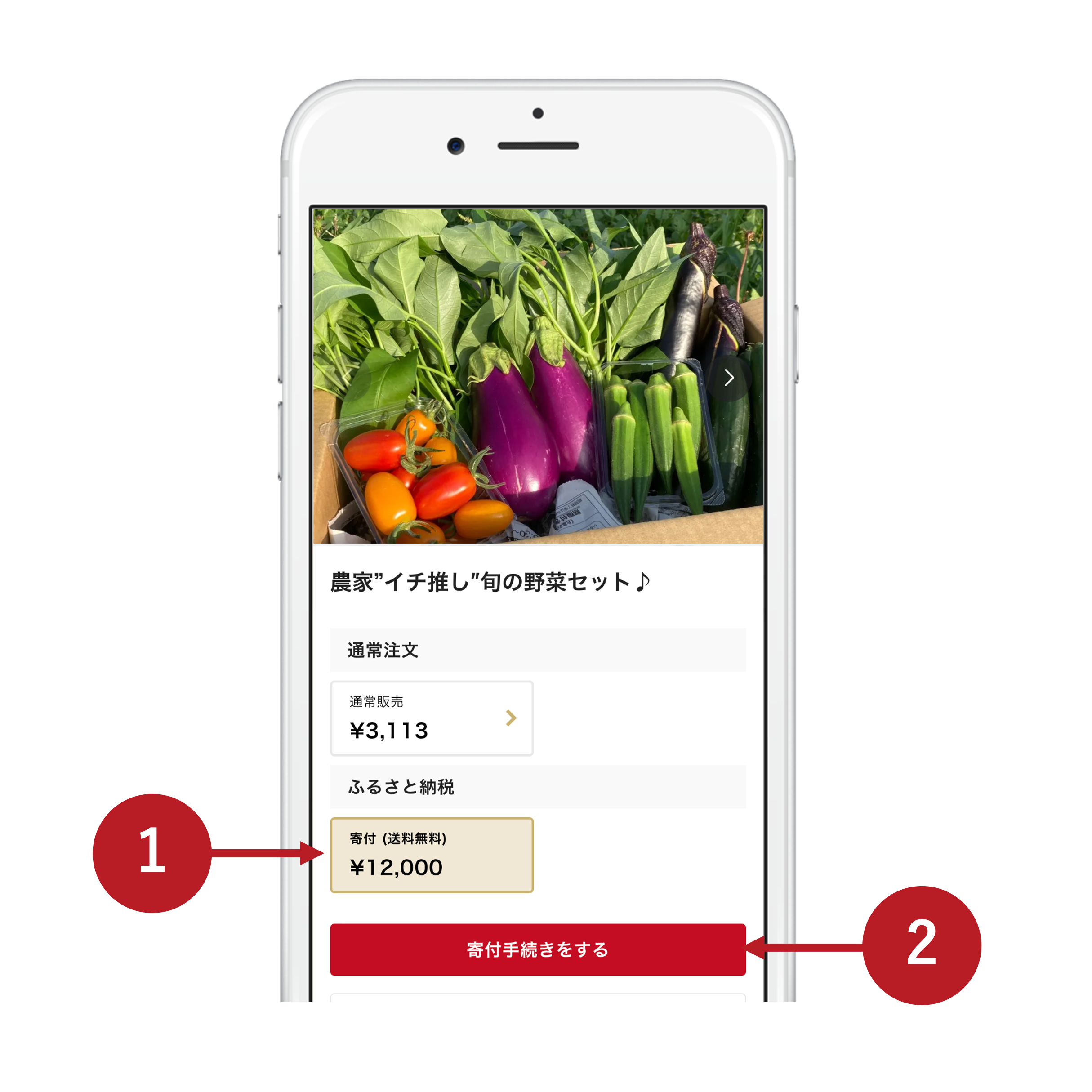 食べチョクの商品ページで「①ふるさと納税」を選択し「②寄付手続きをする」をタップしてお申し込みください。※現状Web版のみの提供