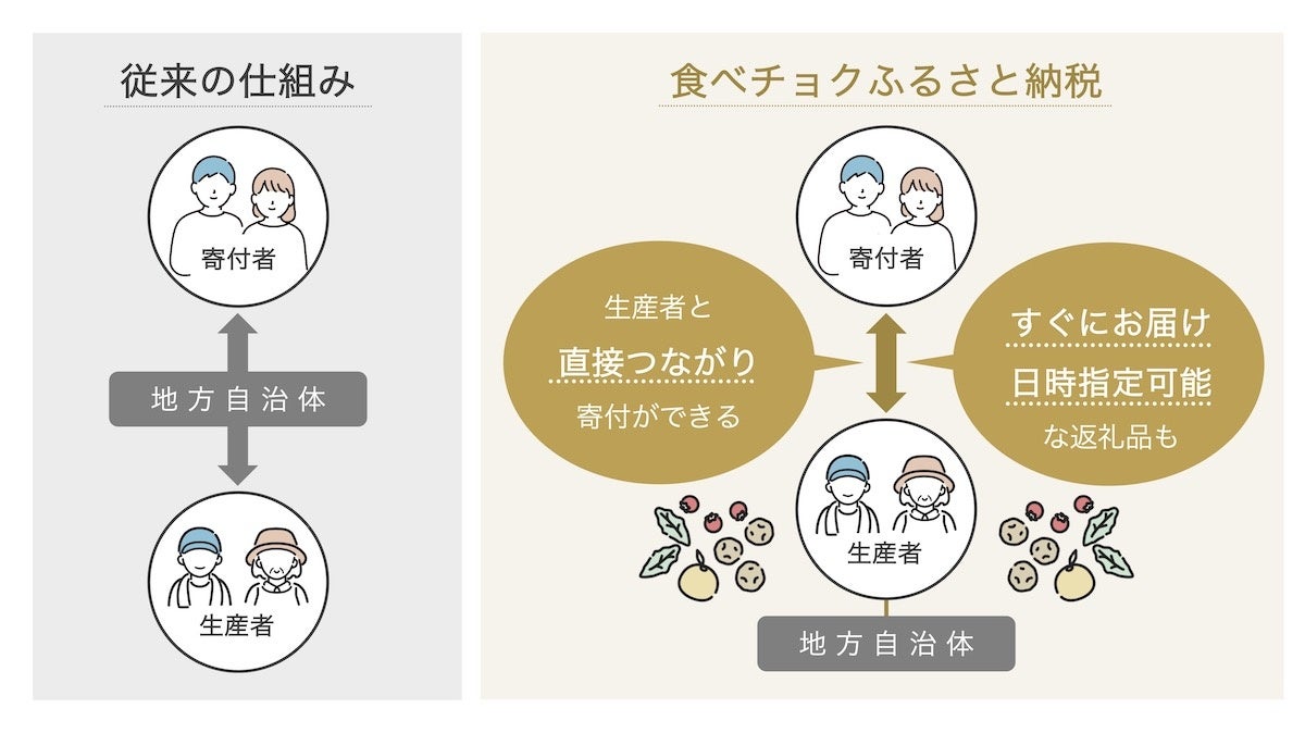 食べチョクふるさと納税は、寄付者と生産者の間に自治体や中間業者などが入る従来のふるさと納税サービスとは異なり両者が直接繋がれるため、寄付者は生産者や地域をより身近に感じられます。さらに返礼品が指定でき、通常よりも早く届くなどのメリットがあります。