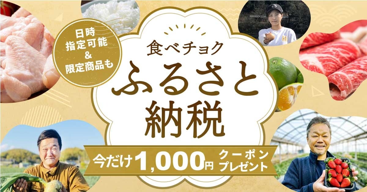初めてのご利用で1万円以上の返礼品を選ぶと、もれなく全員に1,000円分の食べチョククーポンをプレゼントします。