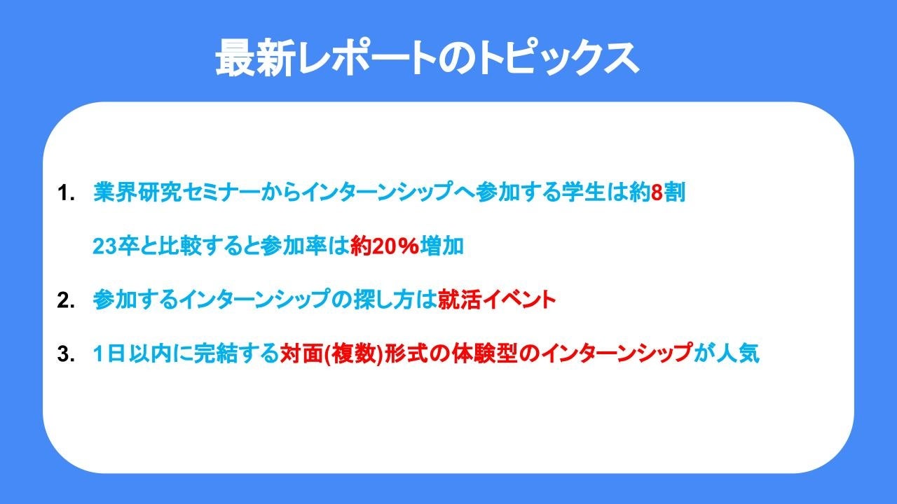 インターンシップの希望参加形態について最も多かったのは【対面(複数)】となった。23卒と比較すると、オンラインより対面を希望する割合が増加している。学生からは、個人だと緊張する、複数のほうが参加ハードルが低い、という声があがっている。