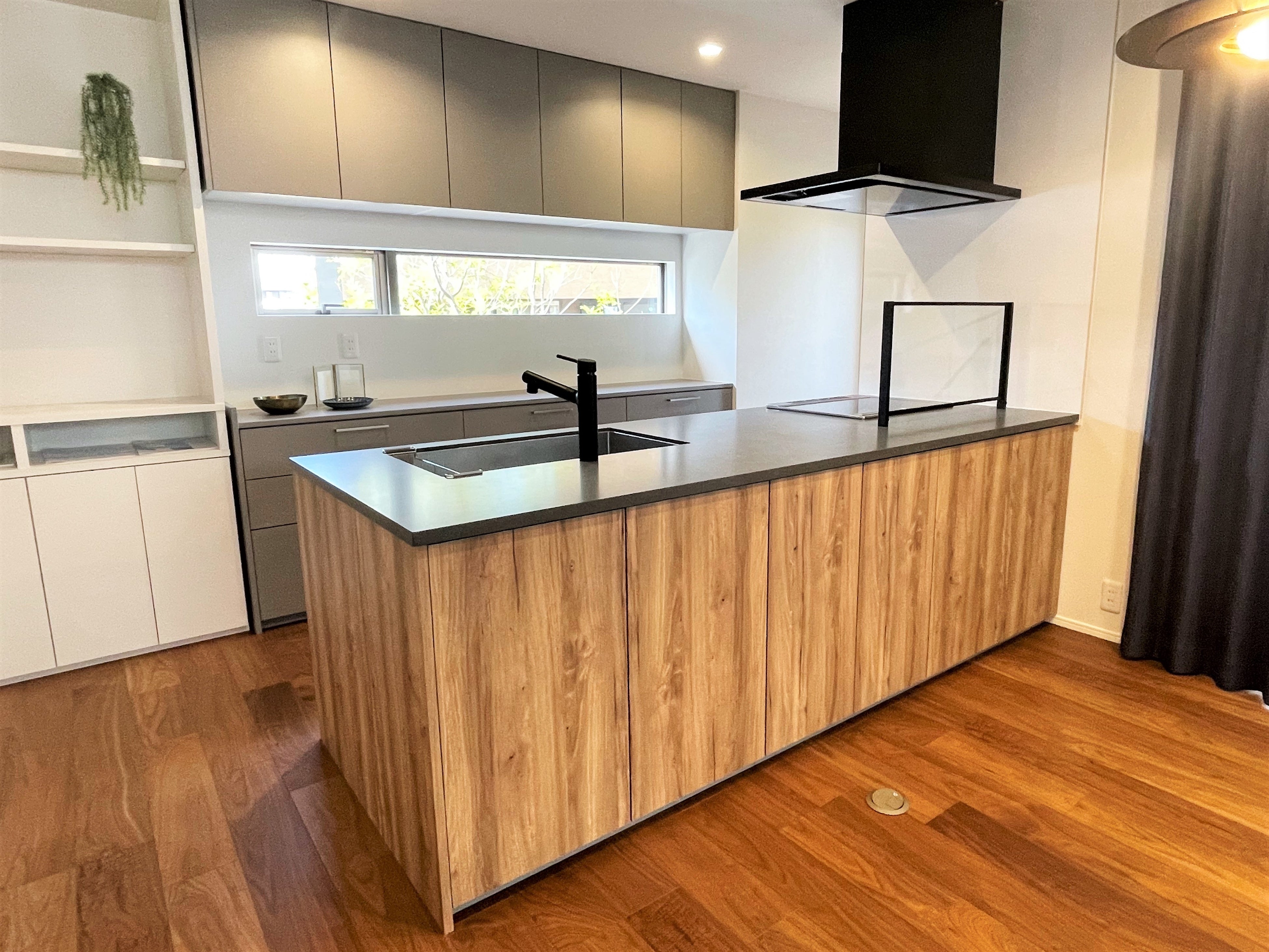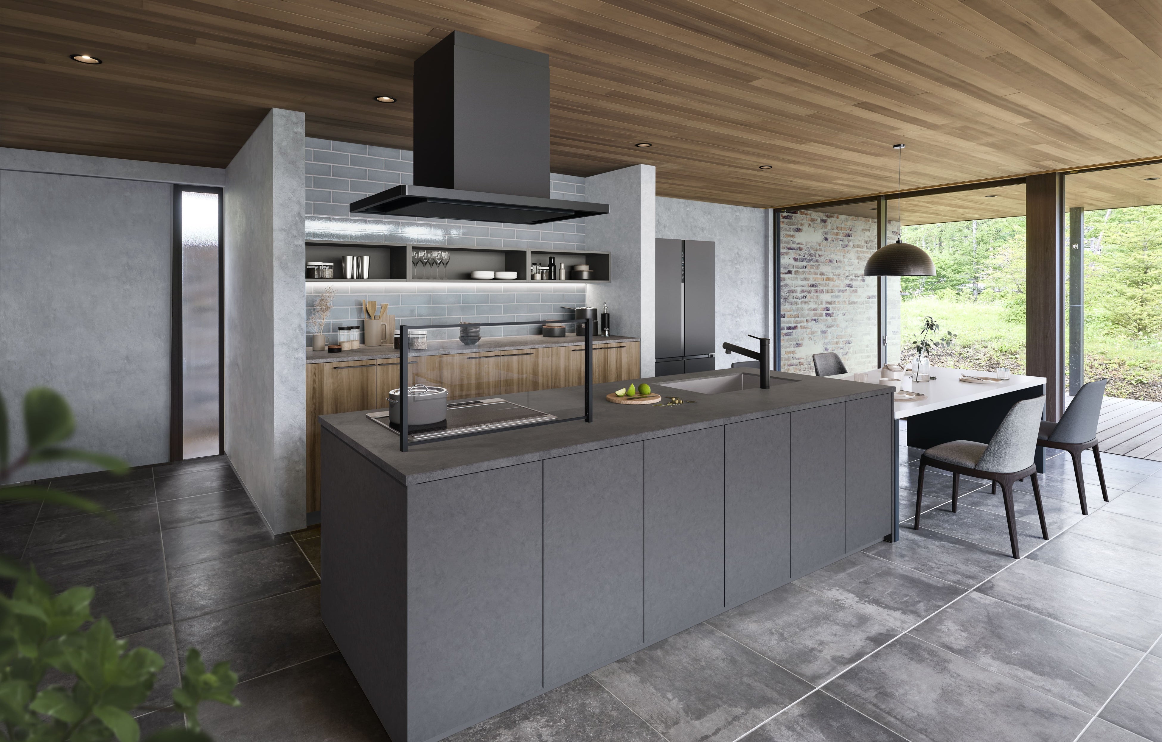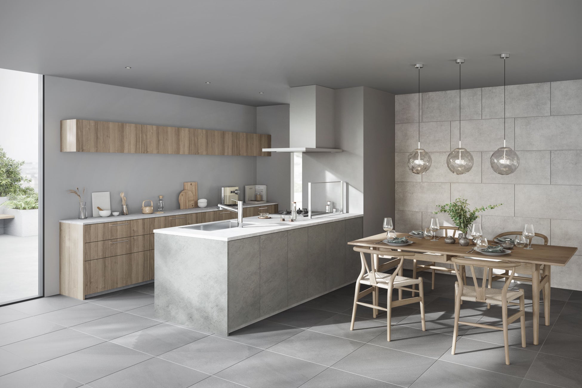 優れた素材や性能にこだわる“本物志向”のニーズが高く、デザインとしては“グレージュ系”“濃色のワークトップ(天板)”“異素材の組み合わせ”が高い人気を集めており、本キッチンは、他キッチンメーカーでは扱いがない高級素材のクォーツストーン(人造石)のワークトップやトレンド感のあるカラーと材質の扉、本キッチンとあわせてコーディネートできるカップボードをご用意いたしました。