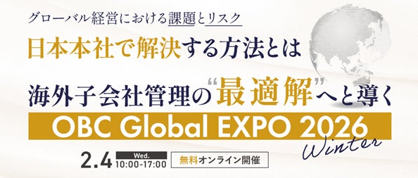 株式会社オービックビジネスコンサルタント(本社:東京都新宿区、代表取締役社長:和田成史、以下OBC)は、2026年2月4日(水)に、海外子会社管理に特化したオンラインイベント「OBC Global EXPO 2026 Winter」を開催いたします。