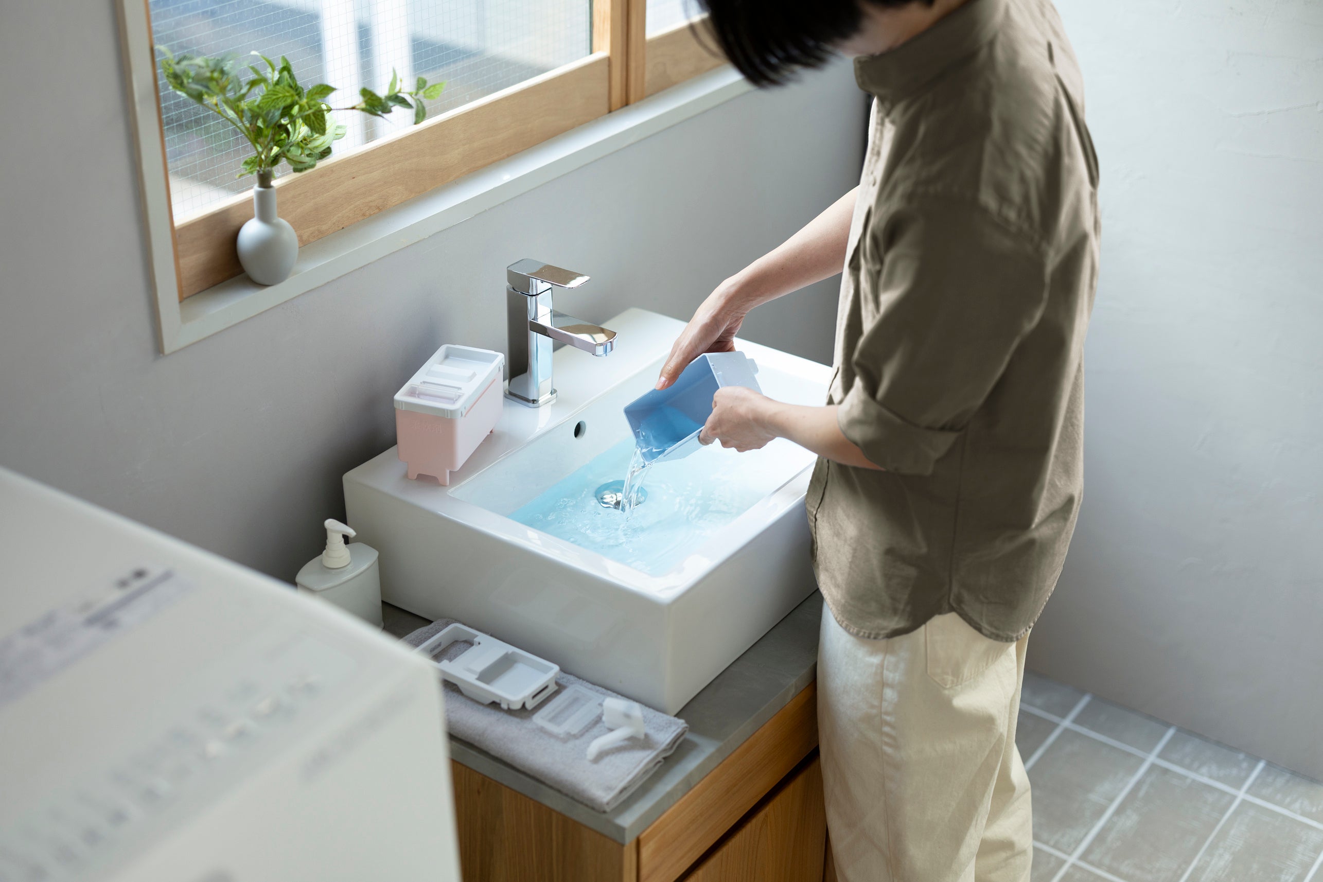 BD-CX100Pは洗濯容量10㎏で本体奥行645mm、CG80Pは洗濯容量8㎏で本体奥行595mmと、住環境や設置条件に応じて選べる2タイプを用意しました。ドア開け時の奥行も薄くした(*5)コンパクト設計により、設置後の前面作業スペースを確保しやすく、限られたスペースにも設置しやすいサイズとしています。また、ドアの開き方向は左開き・右開きから選択でき、直下排水にも対応(*6)するなど、さまざまな住環境で設置できるよう配慮しています。