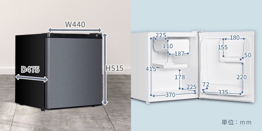 幅44.0cm、奥行47.5cm、高さ51.5cmのコンパクトなサイズのため、ちょっとした空間に収まる使いやすいサイズ感です。今の冷蔵庫に1台プラスして使えば、まとめ買いした食品の保管スペースに困りません。また、寝室や作業部屋に設置して飲み物をストックしておくのにもちょうどいい製品です。