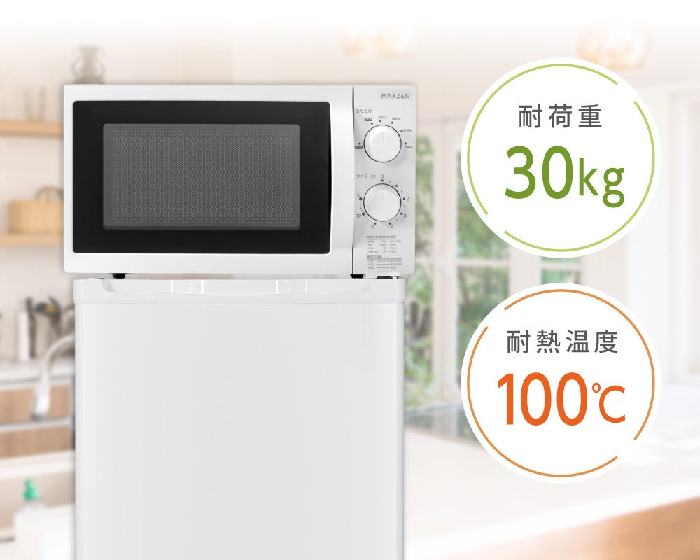 耐熱温度100℃、耐荷重30kgの天面で電子レンジなどをすっきり収納できます。