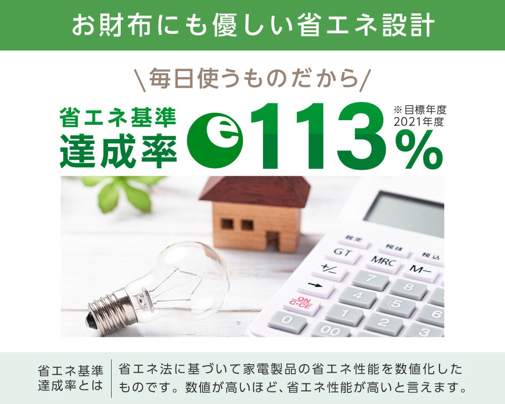 本製品は省エネ基準達成率113%の、環境にもお財布にもやさしい省エネ設計です。