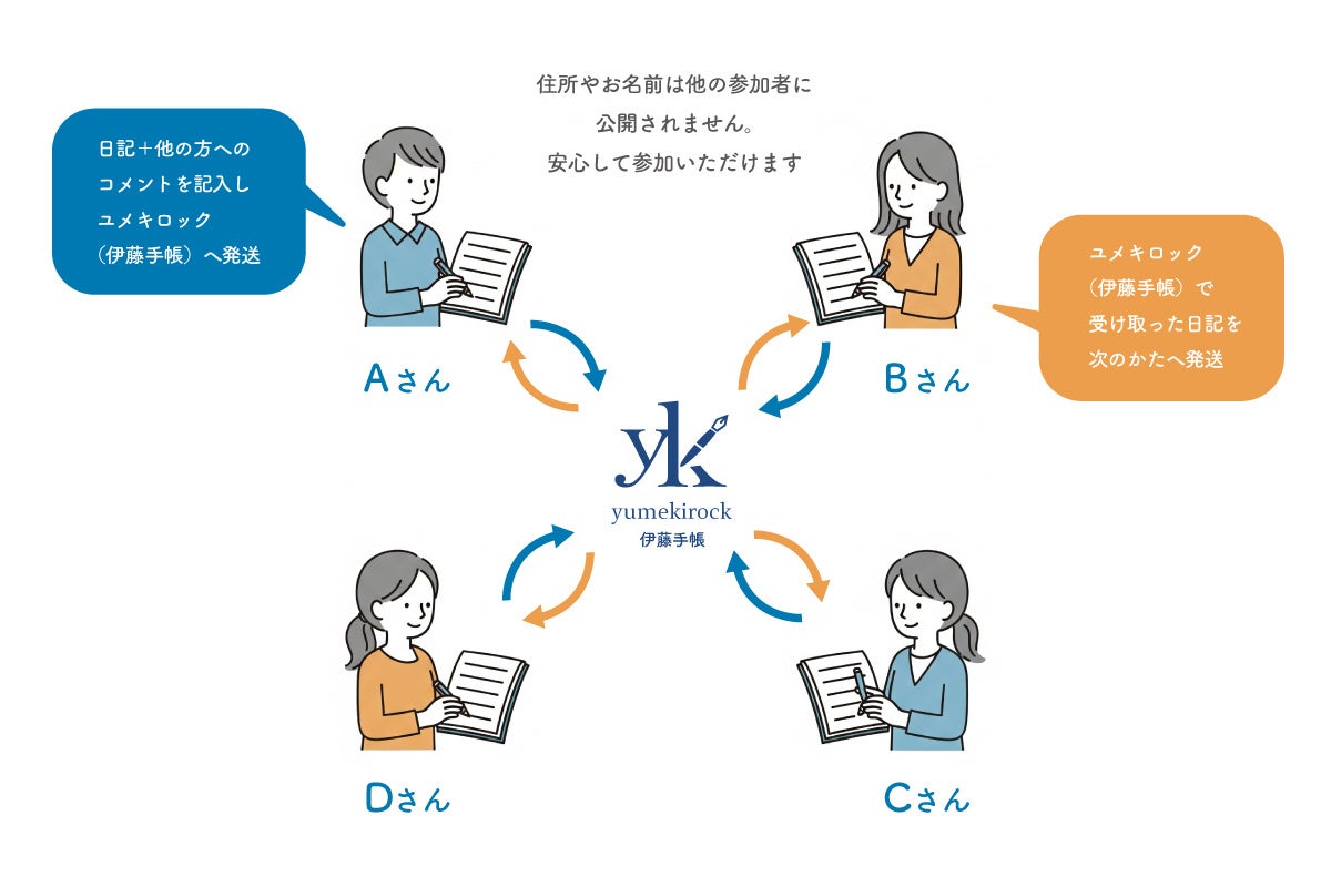 日記のやりとりは伊藤手帳が仲介。参加者は伊藤手帳に日記を送り、伊藤手帳から受け取る仕組みなので、本名や住所が他の参加者に知られることなく安心して参加できます。